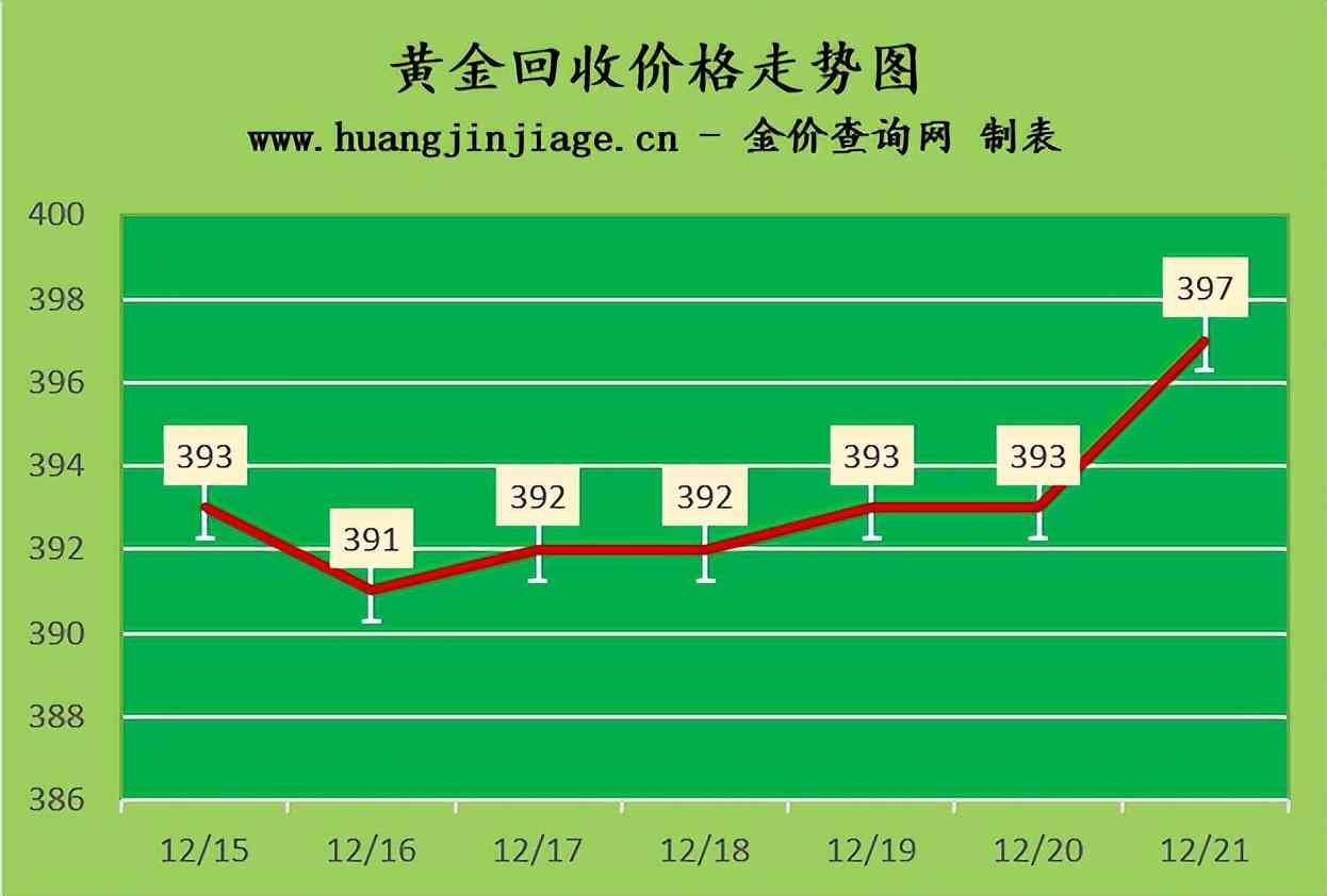 黄金回收价格397元/克,铂金回收价格196元/克,钯金回收价格351元/克,18K金回收价格294元/克,银条回收价格4元/克。(黄金行情是波动的,回收金价没有固定标准。)
