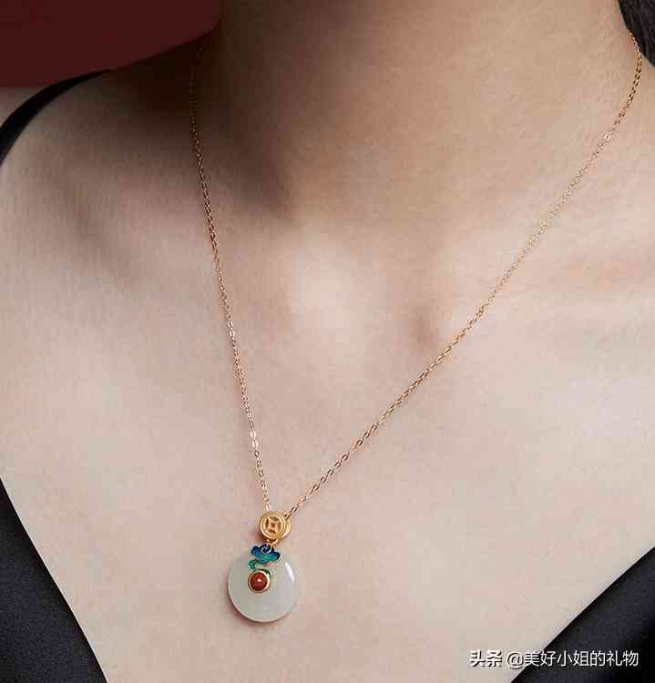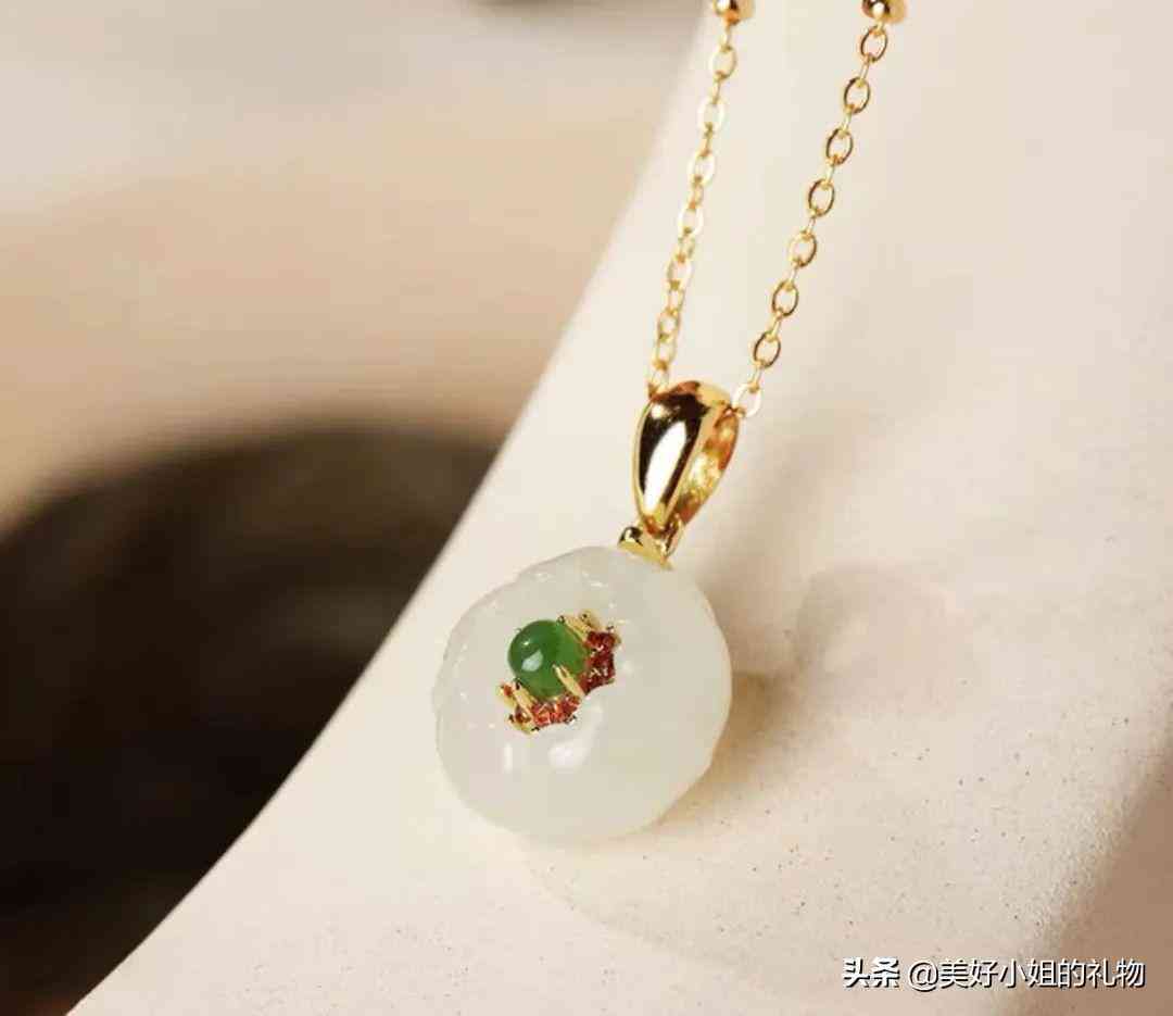 这款平安扣项链选用温润有光泽的和田玉,中间以南红点缀,吊坠上方是冷珐琅工艺的祥云图案,配色柔和又不单调,同系列还有耳环、戒指,淡淡古韵的首饰很适合妈妈优雅的气质。