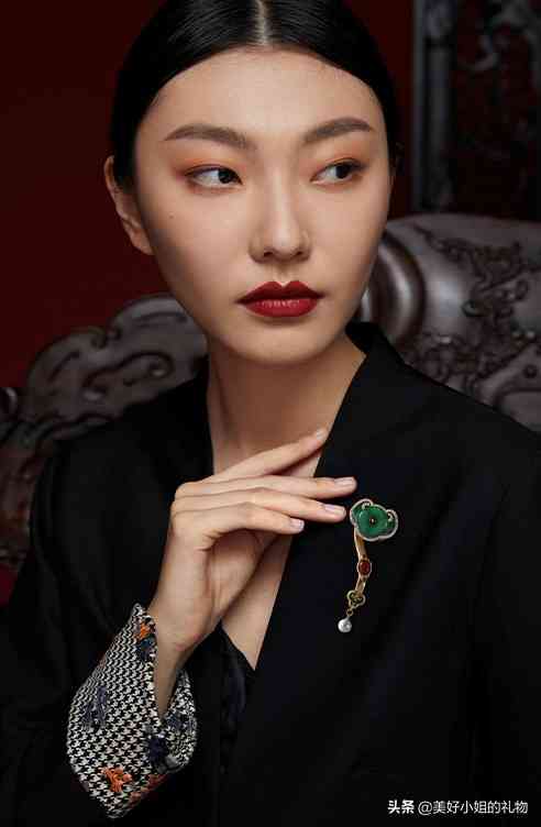 这是一款灵芝玉如意造型的胸针,如意头采用碧绿的玉髓,并以闪耀的锆石勾勒轮廓,长柄中间镶嵌了红玛瑙,尾部用祥云和珍珠点缀,制作过程中用到了冷珐琅、景泰蓝、点翠等古法工艺,满满的细节感,尤其适合送给爱穿旗袍的妈妈们。