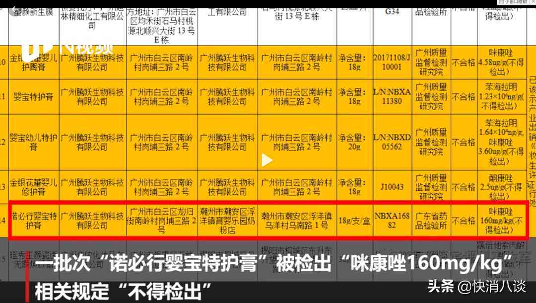 据报道,婴儿护肤品牌诺必行的“婴宝护肤膏”等产品被检测出含有禁用物质,其生产公司广州腾跃生物科技有限公司已被吊销《化妆品生产许可证》。