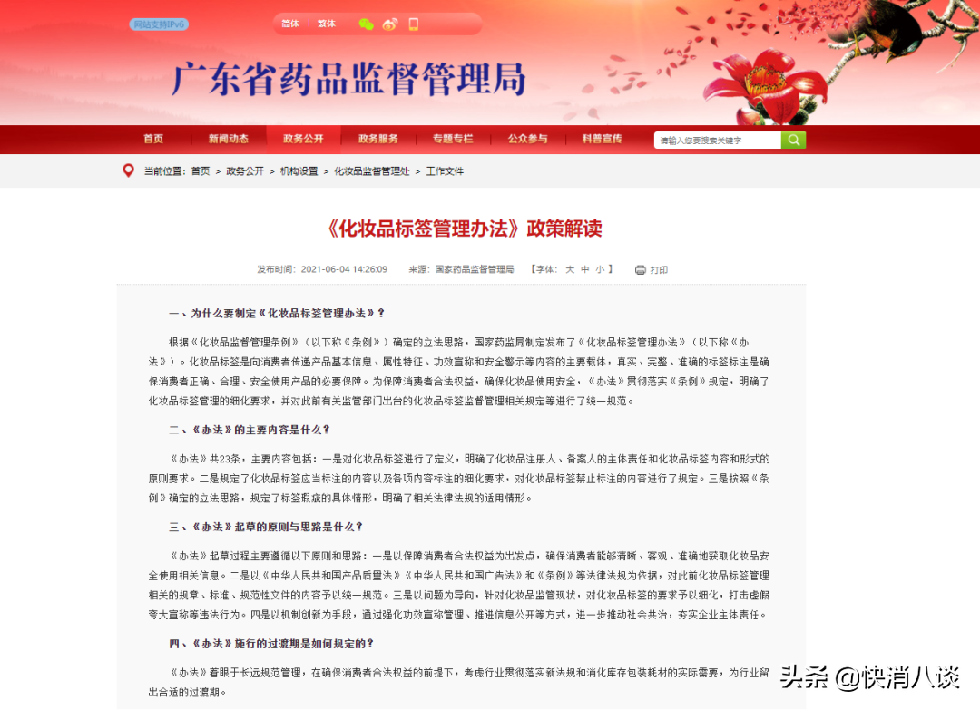 广东省药品监督管理局也在6月4日发布实施《化妆品标签管理办法》,从政策角度规范化妆品标签内容管理。