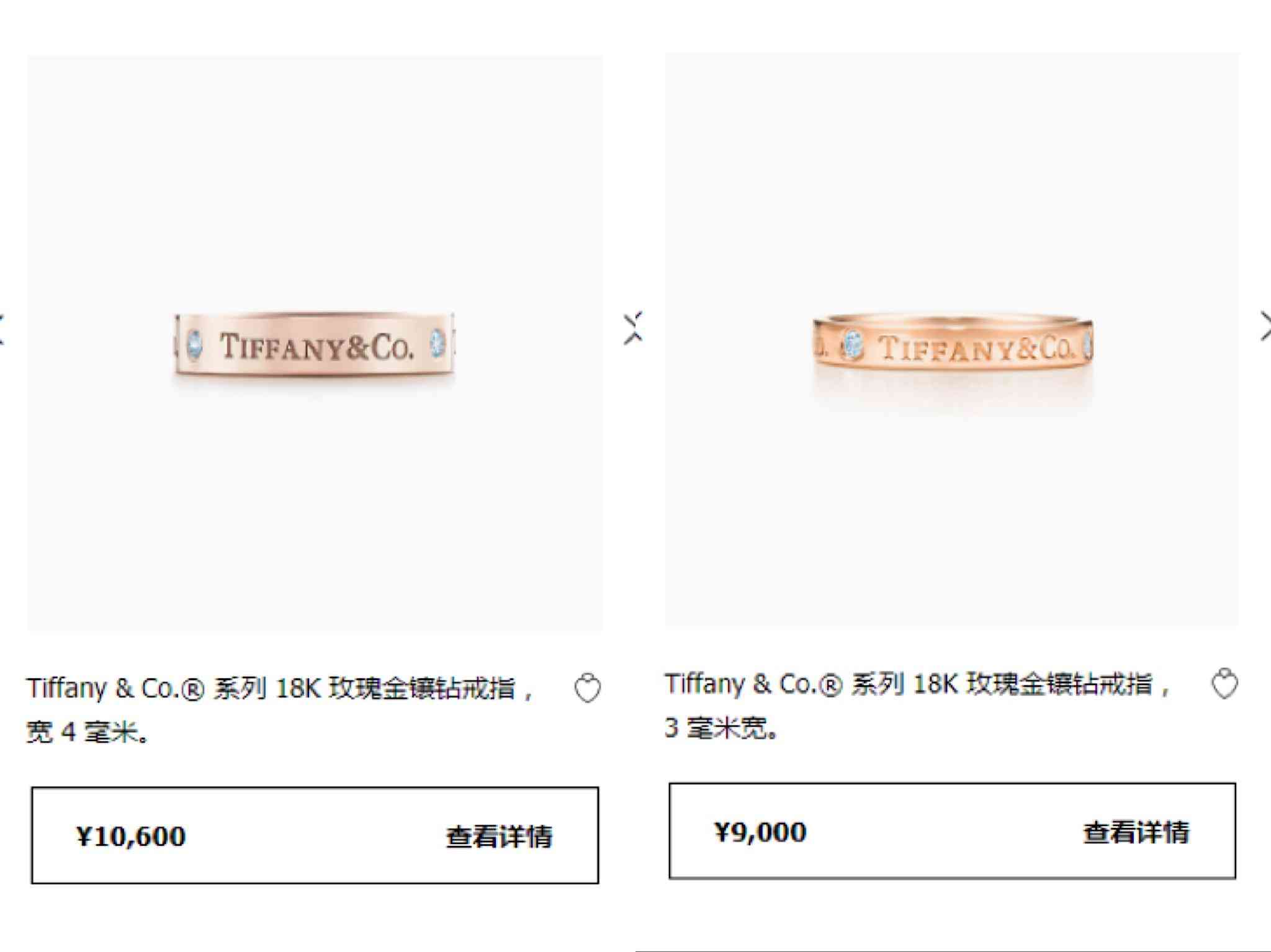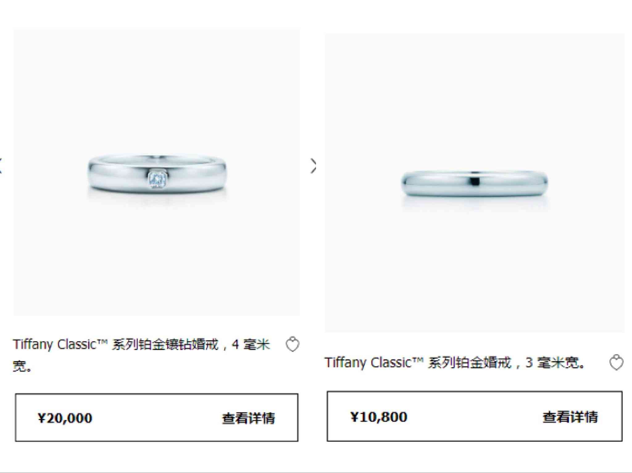以上就是蒂芙尼经典对戒款式的相关介绍,那么蒂芙尼对戒多少钱呢?其实通过以上图片上的标价可以发现,蒂芙尼对戒整体上价格基本自万元左右,少数比较便宜的基础款仅需5000多元,镶钻的在一万元以上。所以蒂芙尼对戒多少钱和它自身款式是有较大关系的,基本是宽版对戒价格大于窄版对戒价格,镶钻对戒价格大于素金对戒价格。