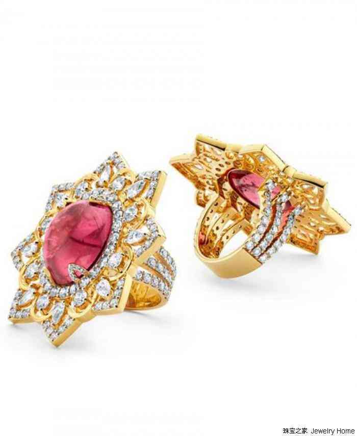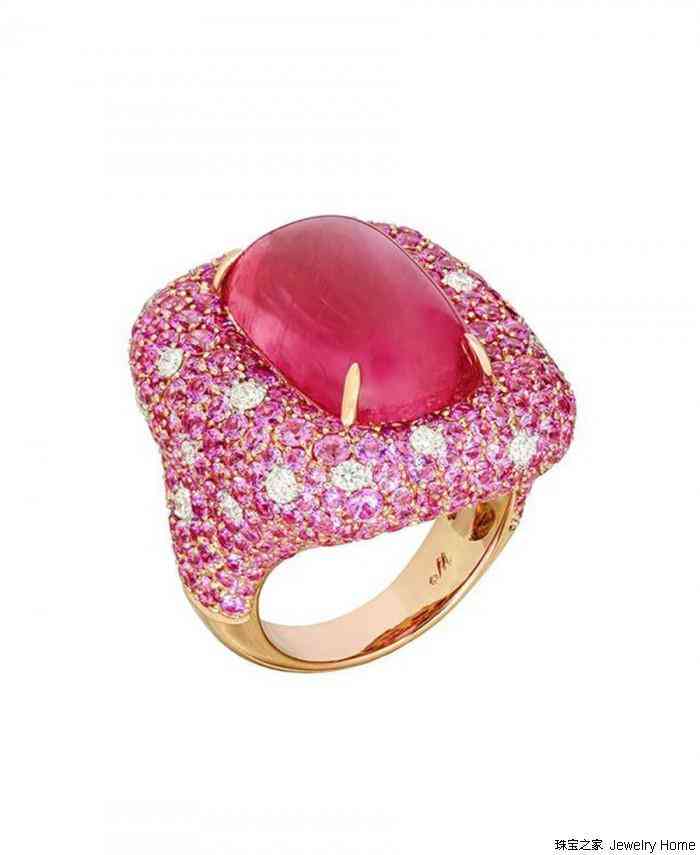 Marbella 凸圆形卢比来戒指,镶饰一颗17.66克拉凸圆形卢比来,周围镶饰粉色蓝宝石和钻石,售价:$ 20,500