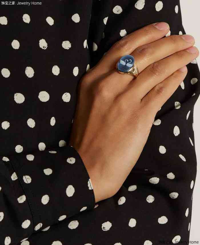 Jacquie Aiche 的这款风格独特的戒指上镶有一块椭圆形的皇家蓝玛瑙,雕刻着两只优雅的天鹅,售价:£ 2,500