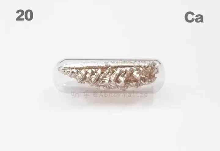 ▲玻封钙晶体,钙的丰度比较大,普通的钙金属比较便宜,但是这种的是晶体钙,有它独特的外貌,非常有艺术感