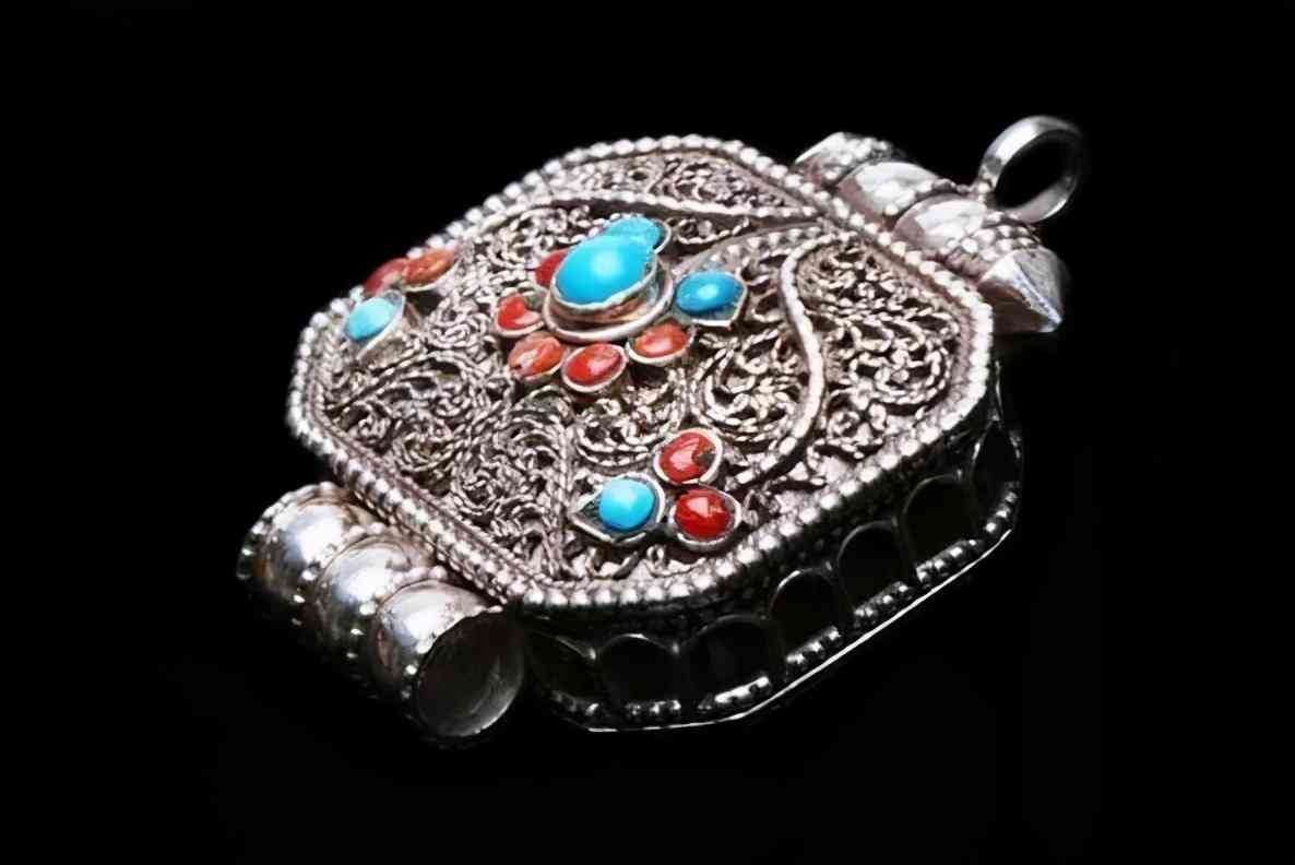 传统藏饰也不乏纯银制品,做工精致,亮度远高于藏银,色泽暗淡,有古旧、古朴感,质朴中彰显高贵。而且传统藏饰镶嵌工艺高超,常常会嵌以红珊瑚、玛瑙、绿松石等。