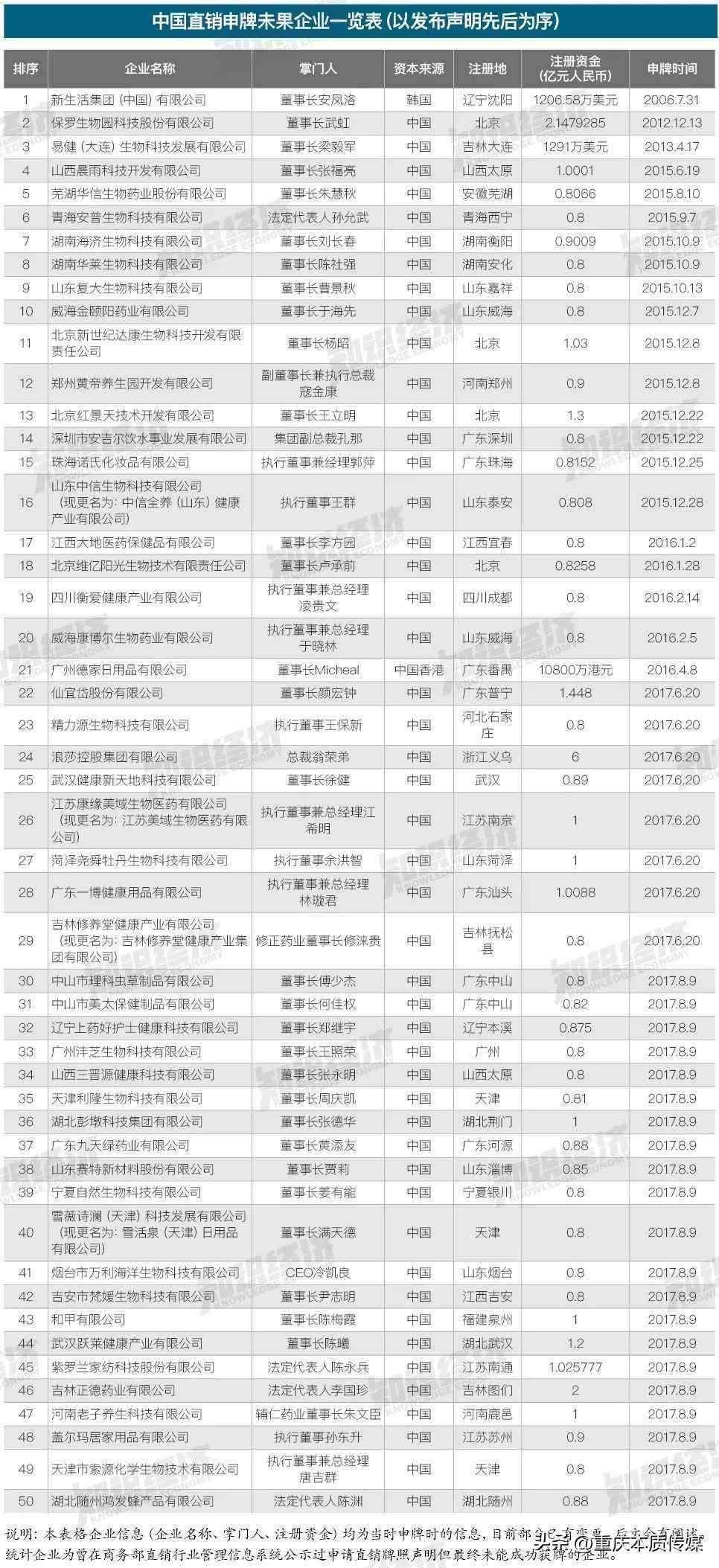 《知识经济》杂志统计了历年来商务部直销行业管理信息系统公示过申请直销牌照声明但未获成功的企业名单,这类企业一共有50家,其他已提交资料或者准备申请直销牌照的企业数量更甚。
