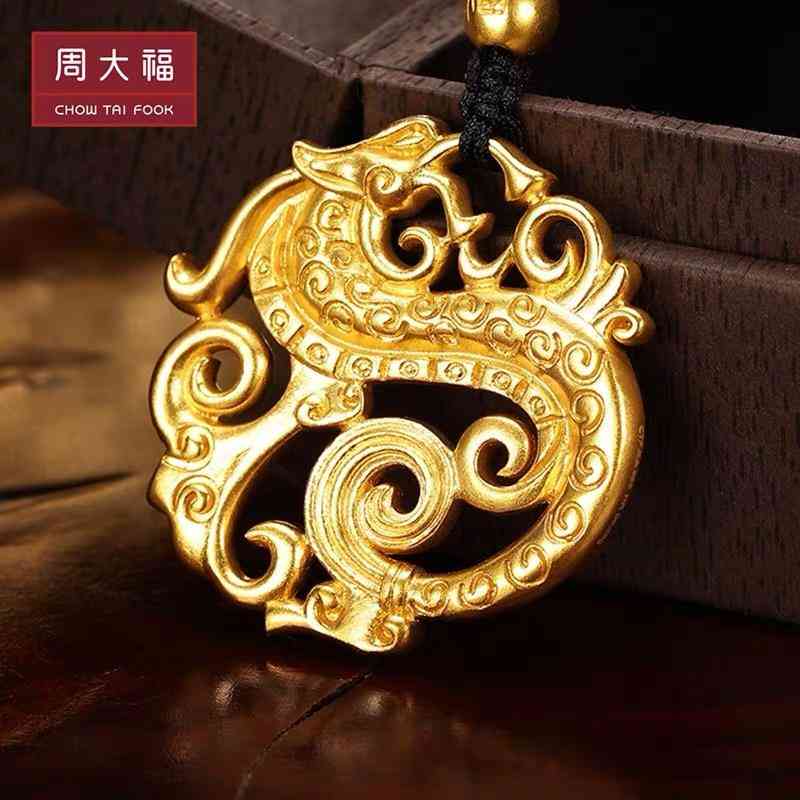 周大福飞龙在天古法黄金足金吊坠,灵感来源于东周团龙白玉佩造型,大气简约,精致典雅。图案自然清晰,层次丰富,栩栩如生。团龙是权势、高贵、荣尊的象征,有着吉祥寓意。