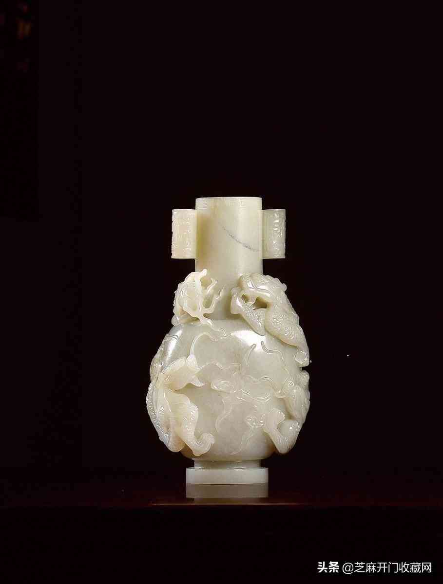 清·青白玉雕龙纹贯耳瓶,尺寸:高17.0厘米,估价:RMB 550,000 ~ 750,000,成交价: RMB 1,495,000