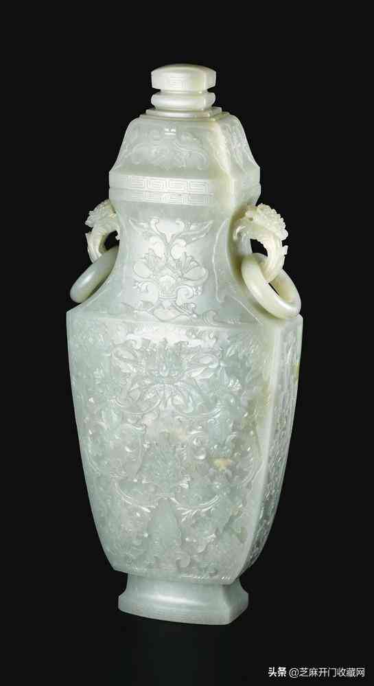 清十八世纪青白玉雕番莲纹双活环耳盖瓶,尺寸:27.5厘米,估价:HKD 1,200,000,成交价: HKD 1,062,500