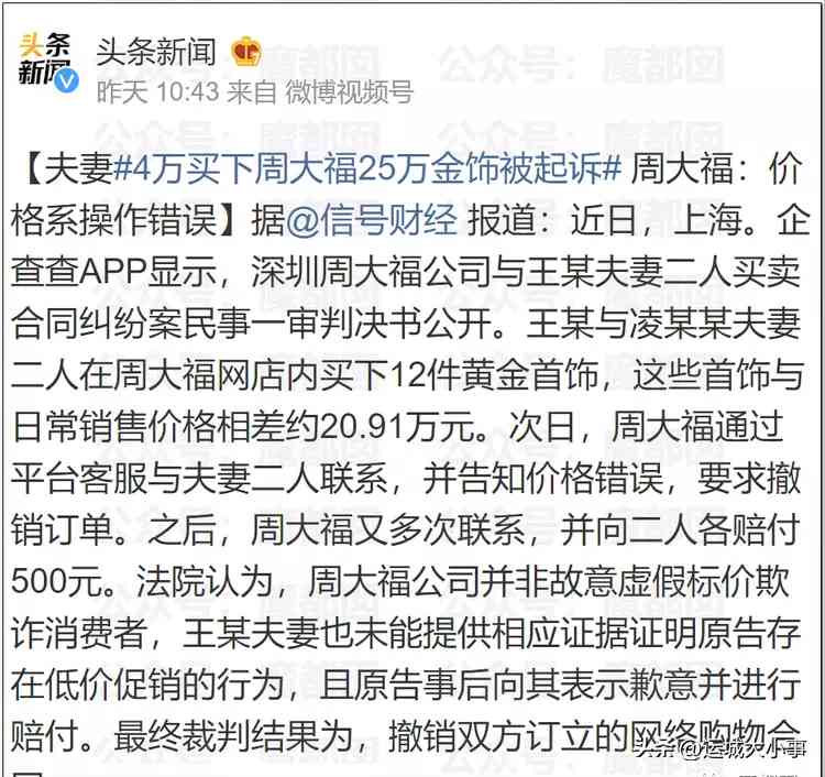 夫妻花4万买下25万金饰,遭周大福起诉称操作失误赔500,法院判了