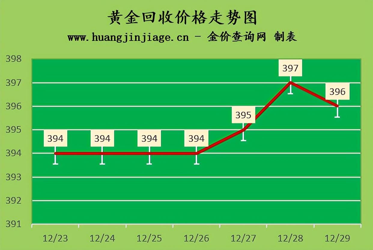 黄金回收价格396元/克,铂金回收价格193元/克,钯金回收价格362元/克,18K金回收价格293元/克,银条回收价格3.8元/克。(黄金行情是波动的,回收金价没有固定标准。)