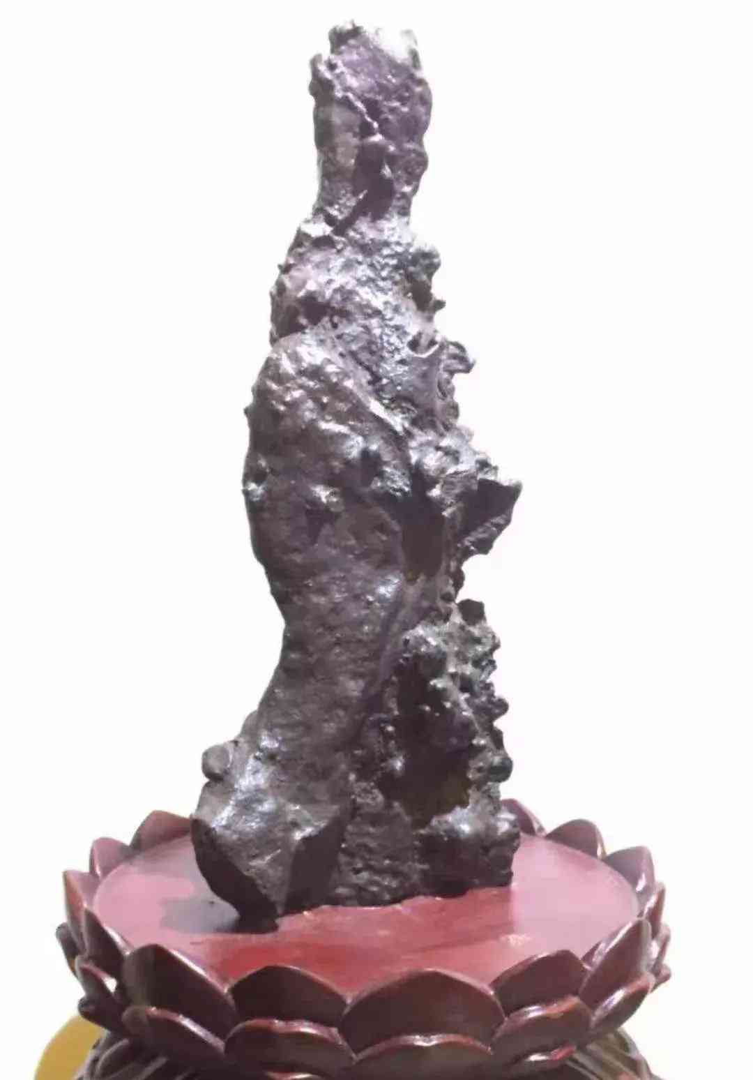 这块铁陨石,形似一尊手持净瓶的观音菩萨,法相庄严,令人肃然起敬。观音菩萨的名字有“观世间音声觉悟有情”的意思在里面。只要有人遇到苦难,诚心念诵观音菩萨的名号,观音菩萨就会寻声救苦,拔众生于苦难之中。这样一块蕴含美好寓意的象形陨石,十分难得。