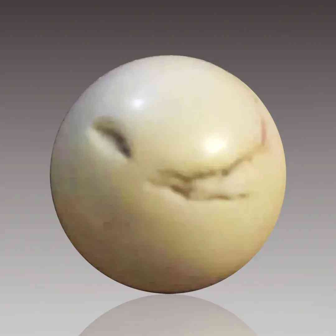 此石呈自然型圆球体,米黄色,不透明,极似上文中提到的“朗斯代尔”。这种陨石十分稀少,是世界上第二硬的矿石,比普通钻石硬度高出58%。在美国华盛顿博物馆里,有一颗直径约为1厘米大小的“朗斯代尔”。