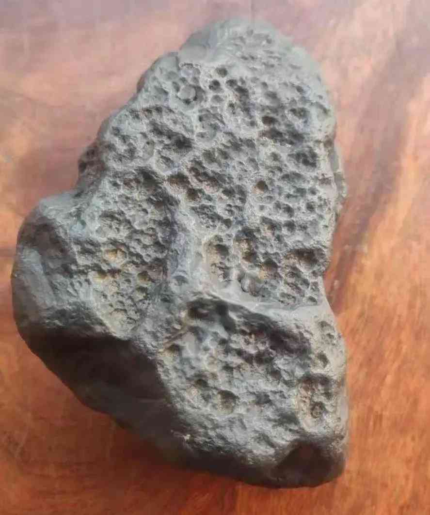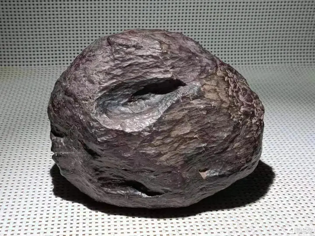 此石表面有明显的定向熔流线和气印,是陨石降落到地球,在通过大气层时表面被高达2000℃的温度轻微融化,所独有的特征。槽沟和熔沟也很明显,其中最大的一个沟洞在石体正中间,像一只深邃的眼睛,诉说着来自宇宙的奥秘。