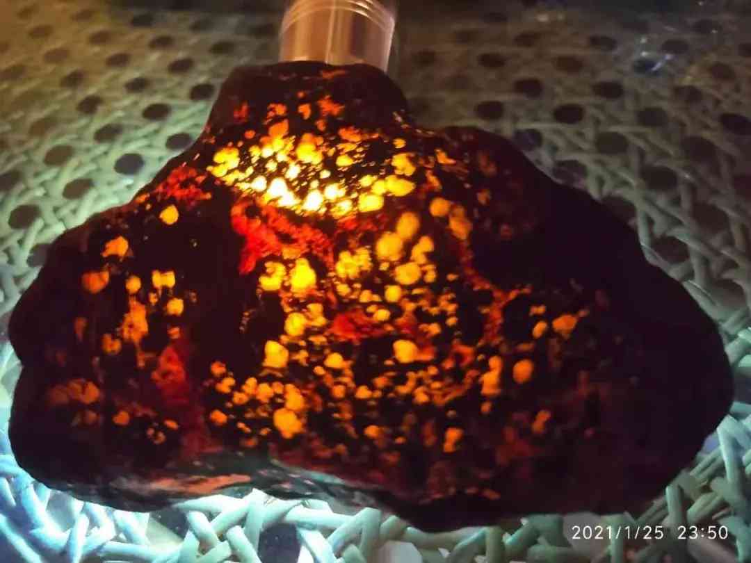 这块玻璃陨石,品相非常漂亮,上面大大小小的气印,是陨石穿过大气层时,在高温高压作用力下产生的痕迹。这些撞击地球的印记,具有宝贵的科研价值。玻璃陨石内常有气泡空腔,用手电照射,石体呈金黄色,从气泡中折射中星星点点的光,晶莹剔透。