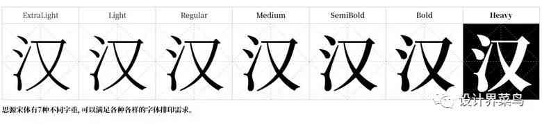 数量: 标准为 7 种粗细字体:ExtraLight、Light、Normal、Regular、Medium、Bold 和 Heavy