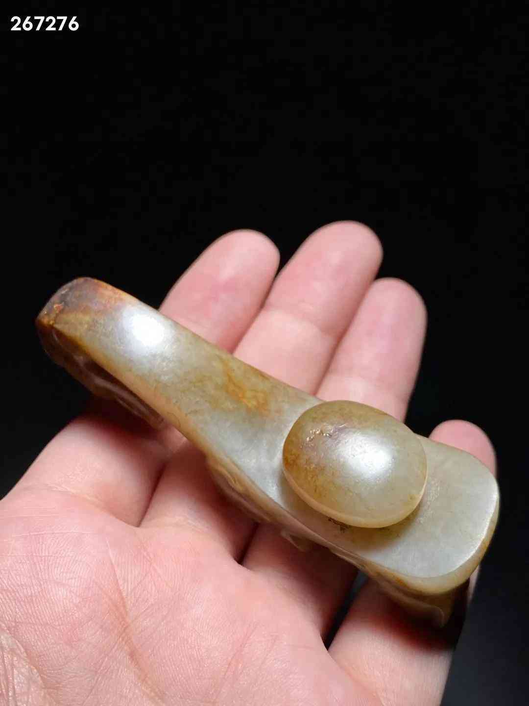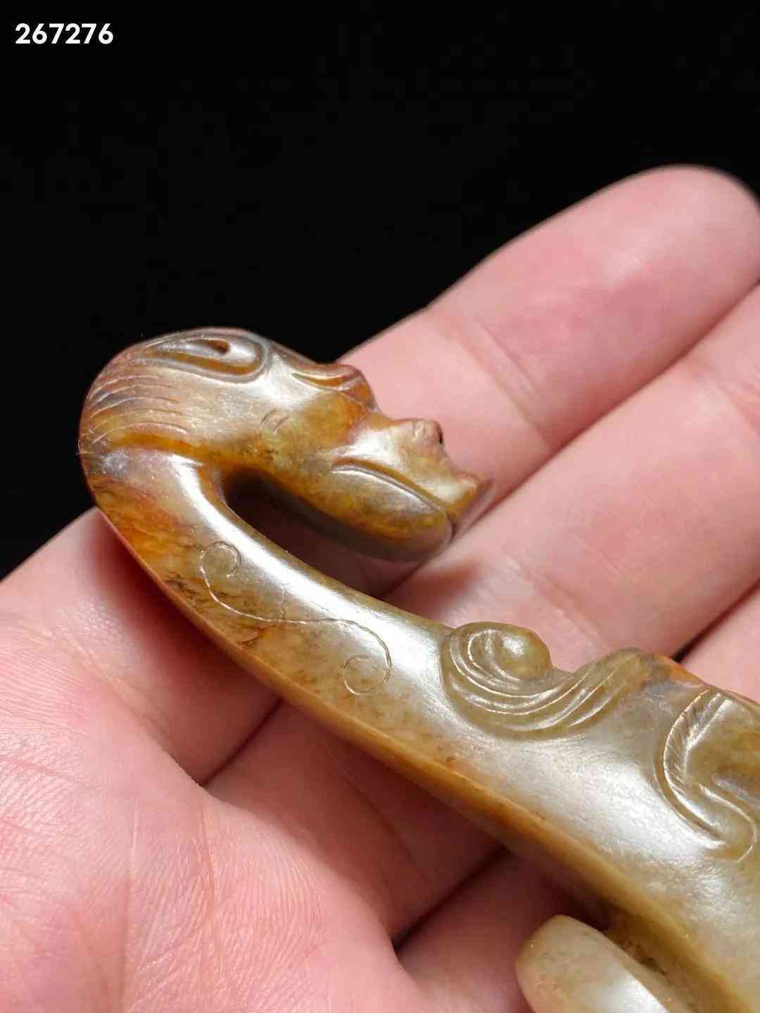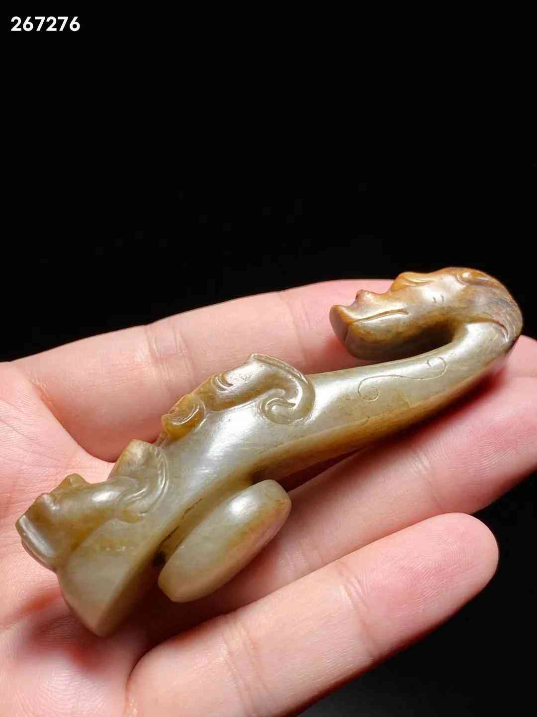 汉 和田玉籽料 螭龙纹 玉带钩 把件 长:8.8 宽:2.5 高:2.8厘米 重:67.6克 此钩和田籽料为材,造型别致,玉质莹润,局部留皮受沁。钩首作龙头状,方脸,大眼稍凸,鼻窄细,嘴方阔。腹上有一小螭龙爬行,身曲折弯绕,灵活矫捷,栩栩如生。底部雕一圆钮,固定衣带所用。带钩起源于西周,战国至秦汉广为流行,是古代贵族和文人雅士所系腰带的挂钩,古又称「犀比」。