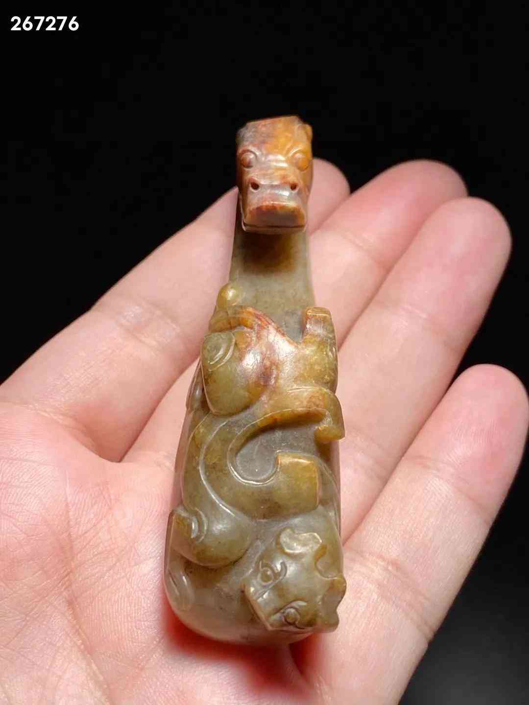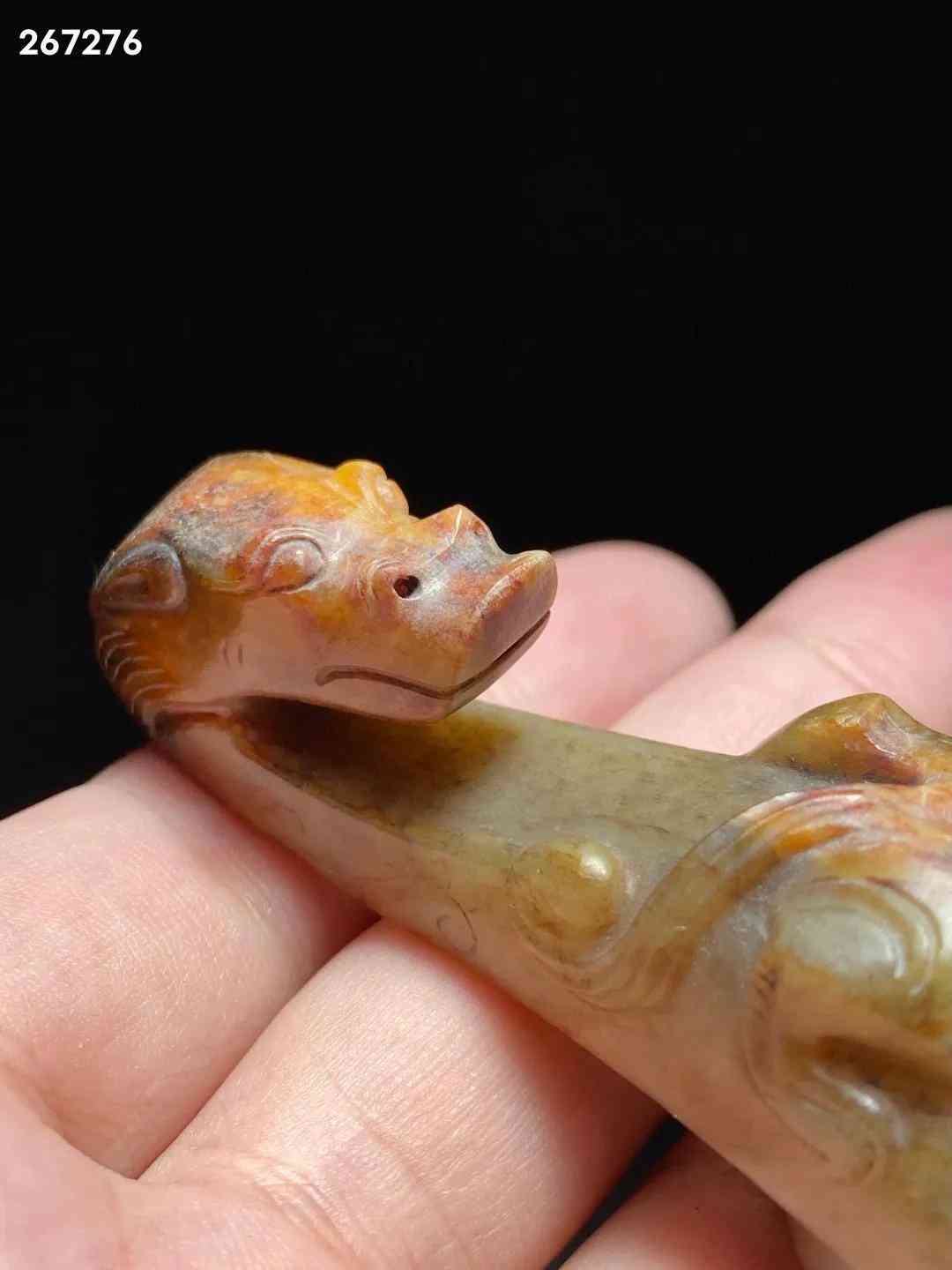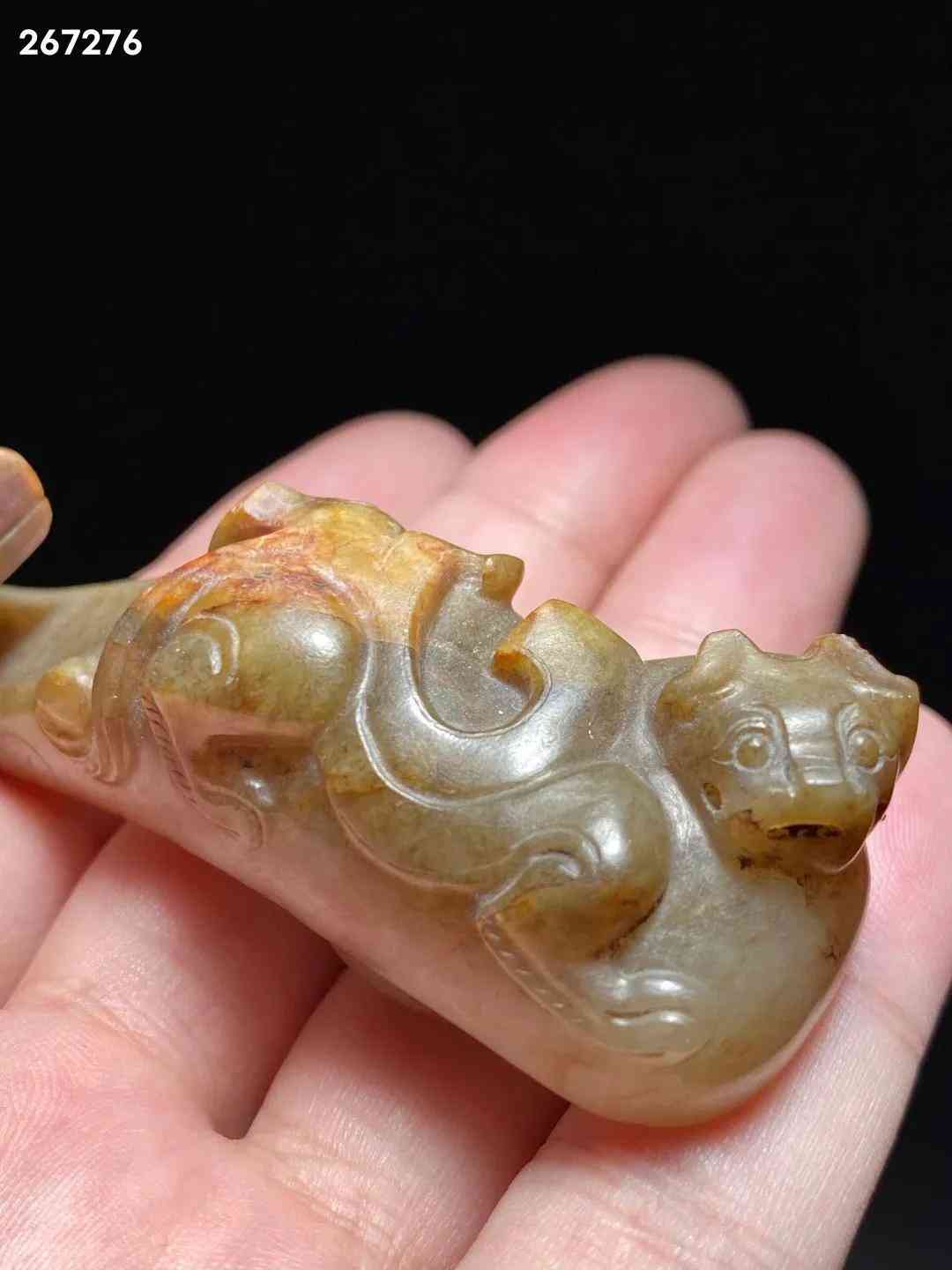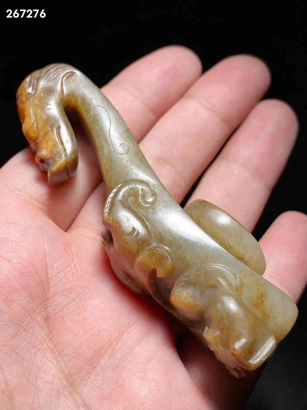 汉 和田玉籽料 螭龙纹 玉带钩 把件 长:8.8 宽:2.5 高:2.8厘米 重:67.6克 此钩和田籽料为材,造型别致,玉质莹润,局部留皮受沁。钩首作龙头状,方脸,大眼稍凸,鼻窄细,嘴方阔。腹上有一小螭龙爬行,身曲折弯绕,灵活矫捷,栩栩如生。底部雕一圆钮,固定衣带所用。带钩起源于西周,战国至秦汉广为流行,是古代贵族和文人雅士所系腰带的挂钩,古又称「犀比」。