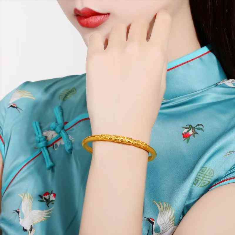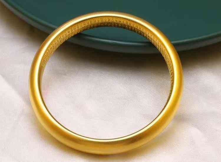 外圈花纹圆镯:内圆外圆的古法黄金手镯,在手镯外侧表面雕刻有莲花、金刚经等花纹,也是经典的古法黄金手镯之一。