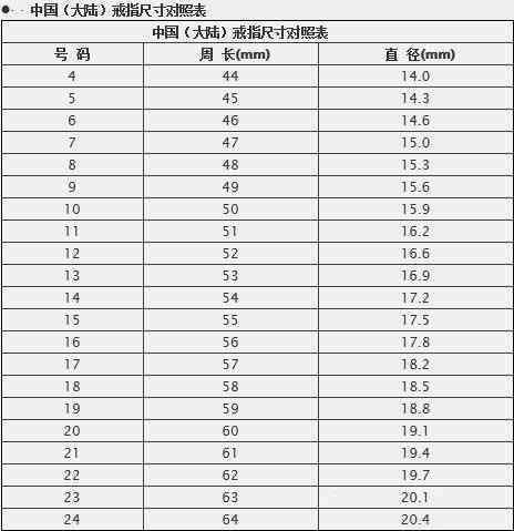 大陆版尺码范围是从4号到26号之间,周长范围是44mm至66mm,直径范 围是14mm至20.7mm。如果购买的戒指以大陆版尺码为主,则可参照下表。