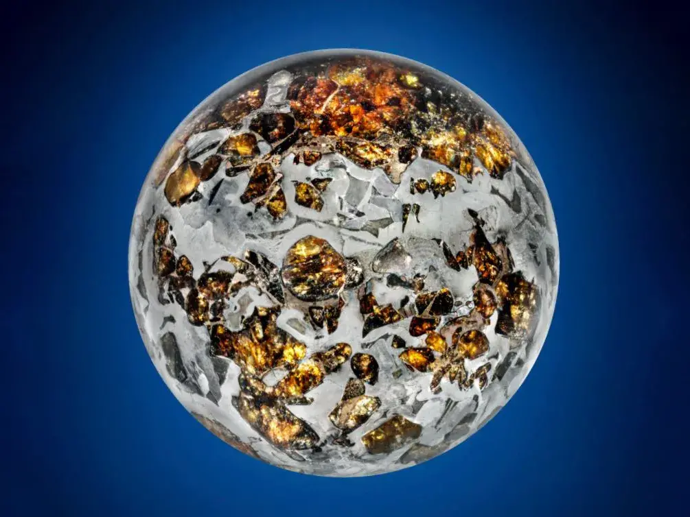 橄榄石陨石拍品,琥珀色橄榄石晶体悬浮在铁镍合金中(图源佳士得官网)