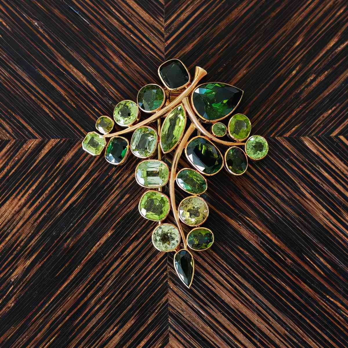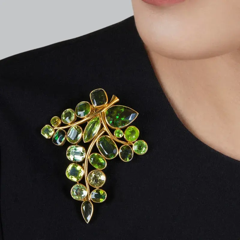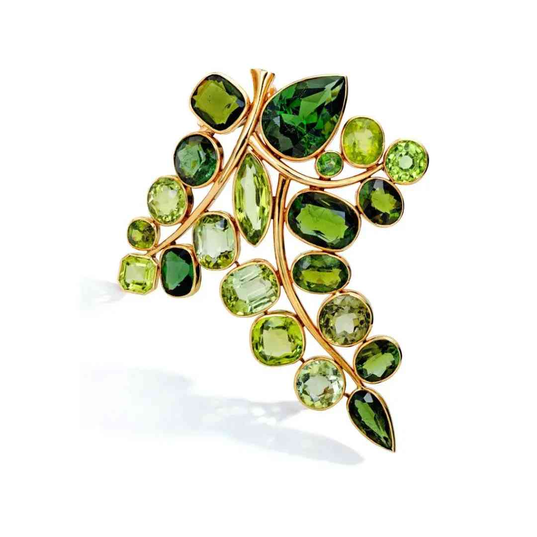 风格化的树叶设计,镶嵌不同切割的橄榄石、绿色碧玺,来自法国,设计打造于1950年。