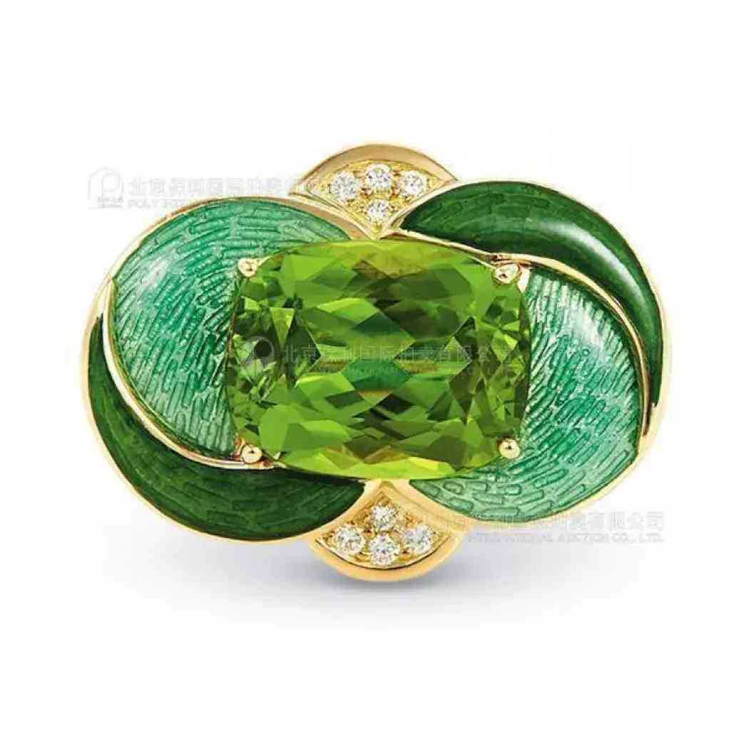 18K金镶嵌11.29克拉天然橄榄石及珐琅吊坠,明媚清新,珐琅色调唯美亮丽,相得益彰,精巧可爱,可作为胸针佩戴。