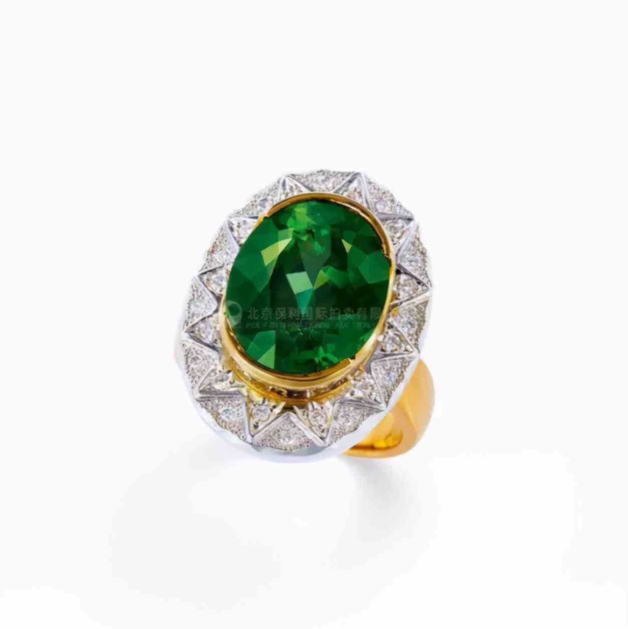 18K金镶嵌34.78克拉椭圆形明亮式切割橄榄石,配钻石戒指,主石硕大饱满,内部清澈透明,橄榄绿色清新明快。经鉴定产自缅甸,未经加热处理。