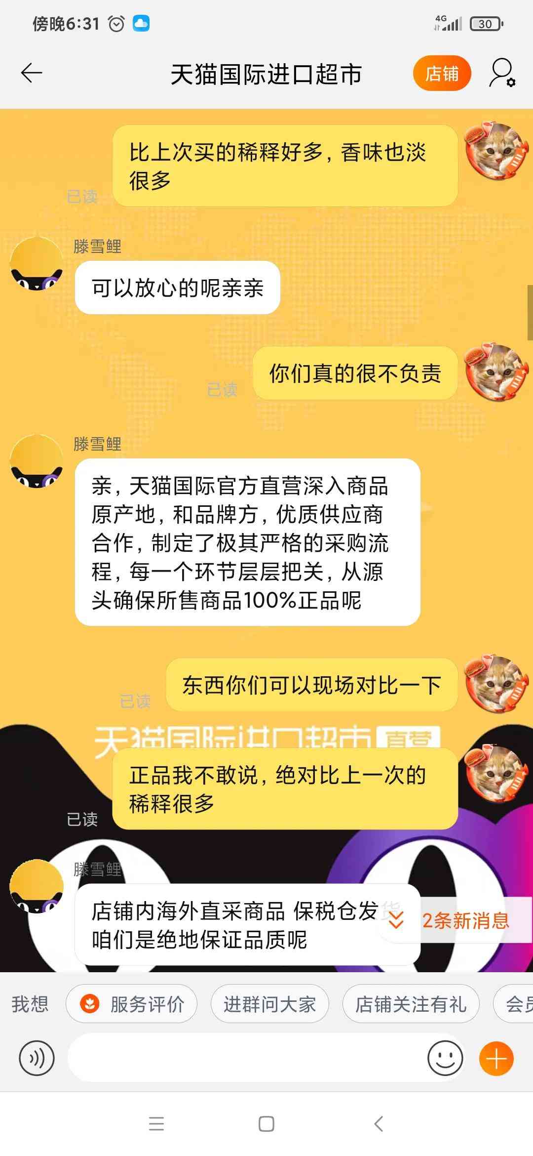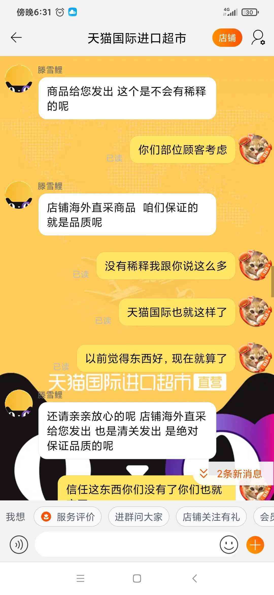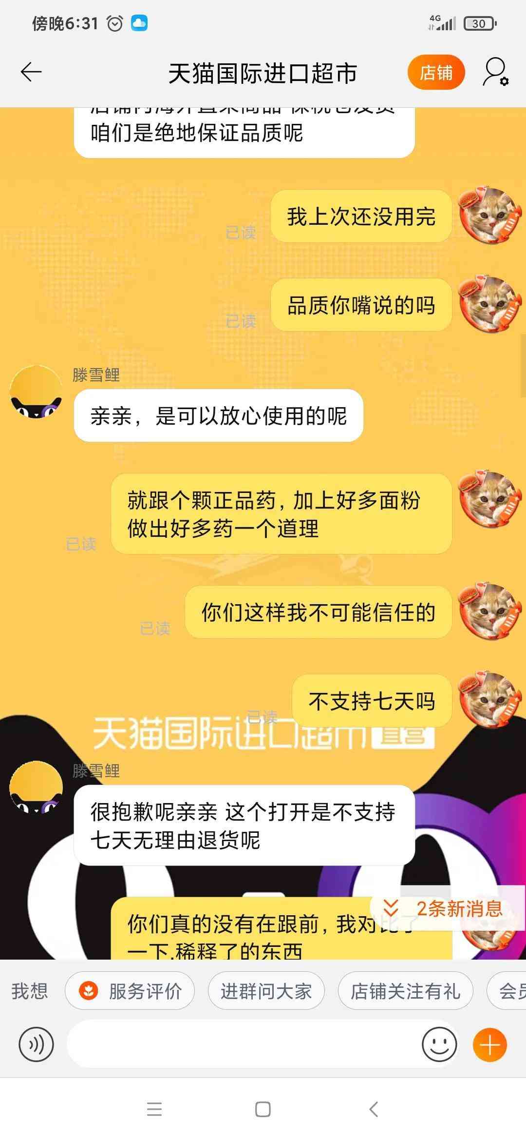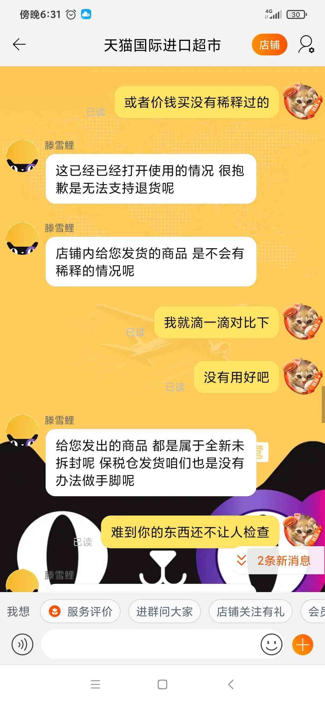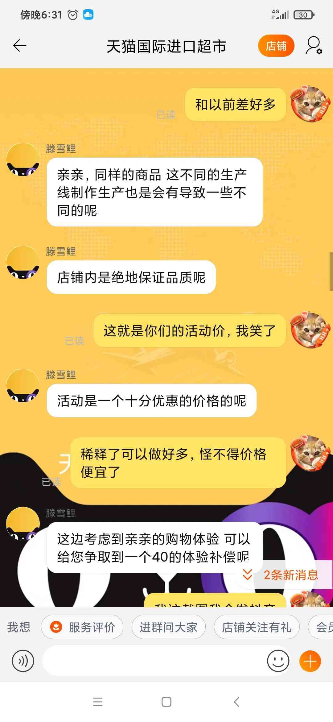 天猫国际超市买的兰芝化妆品套装活动价比正常价优惠差不多50元,买到的东西和以前的东西对比了一下眼睛都可以看出稀释了好多,客服一直说正品放心,不支持七天,包装拆开无法二次销售,等等。我是真的无言以对。希望大家以后活动优惠价一定要小心套路,提价再打折。或者优惠后水乳化妆品什么的被稀释,就算稀释了也是正品.也没有人帮你处理这样的问题。消费者难啊。教了学费,也不算贵。