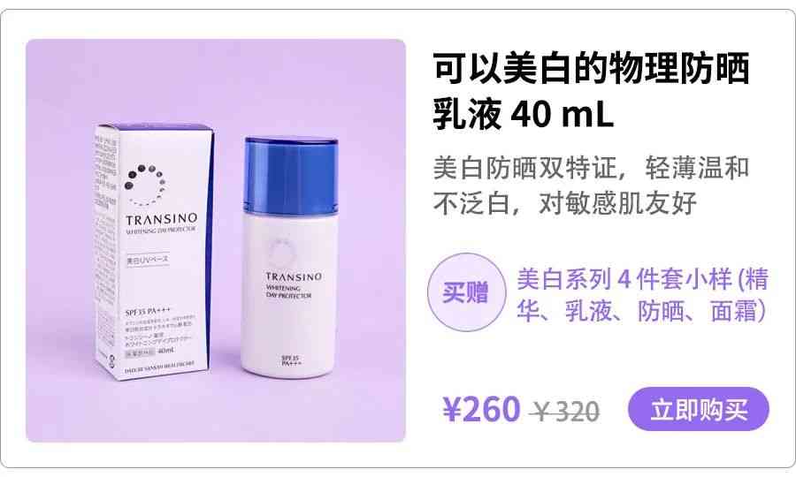 这次开团到手仅需 260 元,同时价值 185 元的美白精华液、乳液、面霜、防晒 4 件套小样,下单就送。是不是超级划算!