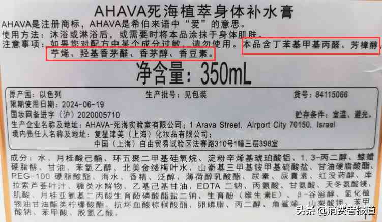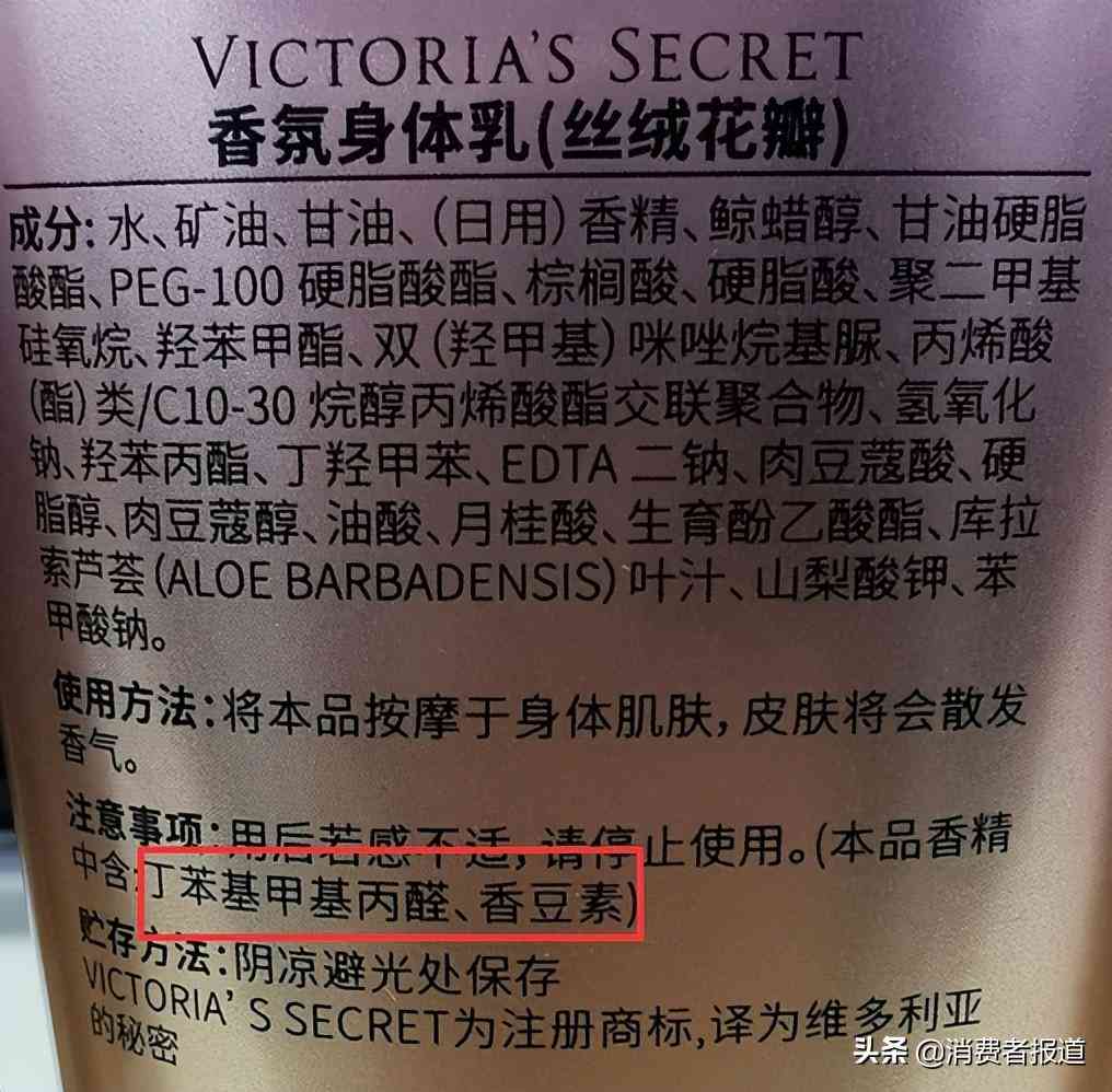 而AHAVA死海植萃身体补水膏、维多利亚的秘密香氛身体乳(丝绒花瓣)两款产品均添加了丁苯基甲基丙醛,也就是铃兰醛。