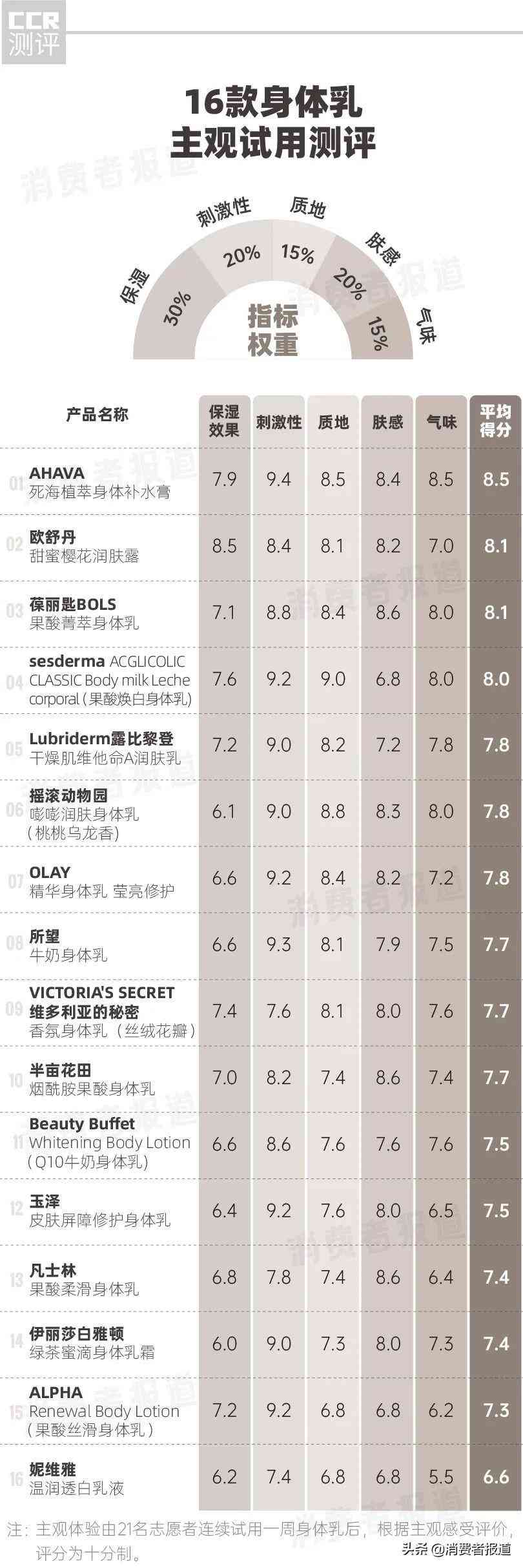 为了解16款身体乳实际使用体验,本刊招募了21名志愿者,性别有男有女,地域有南有北,采用盲测的方式,将身体乳样品分装之后寄到各位志愿者身边。试用评价项目包括保湿、刺激性、质地、肤感、气味5个方面。