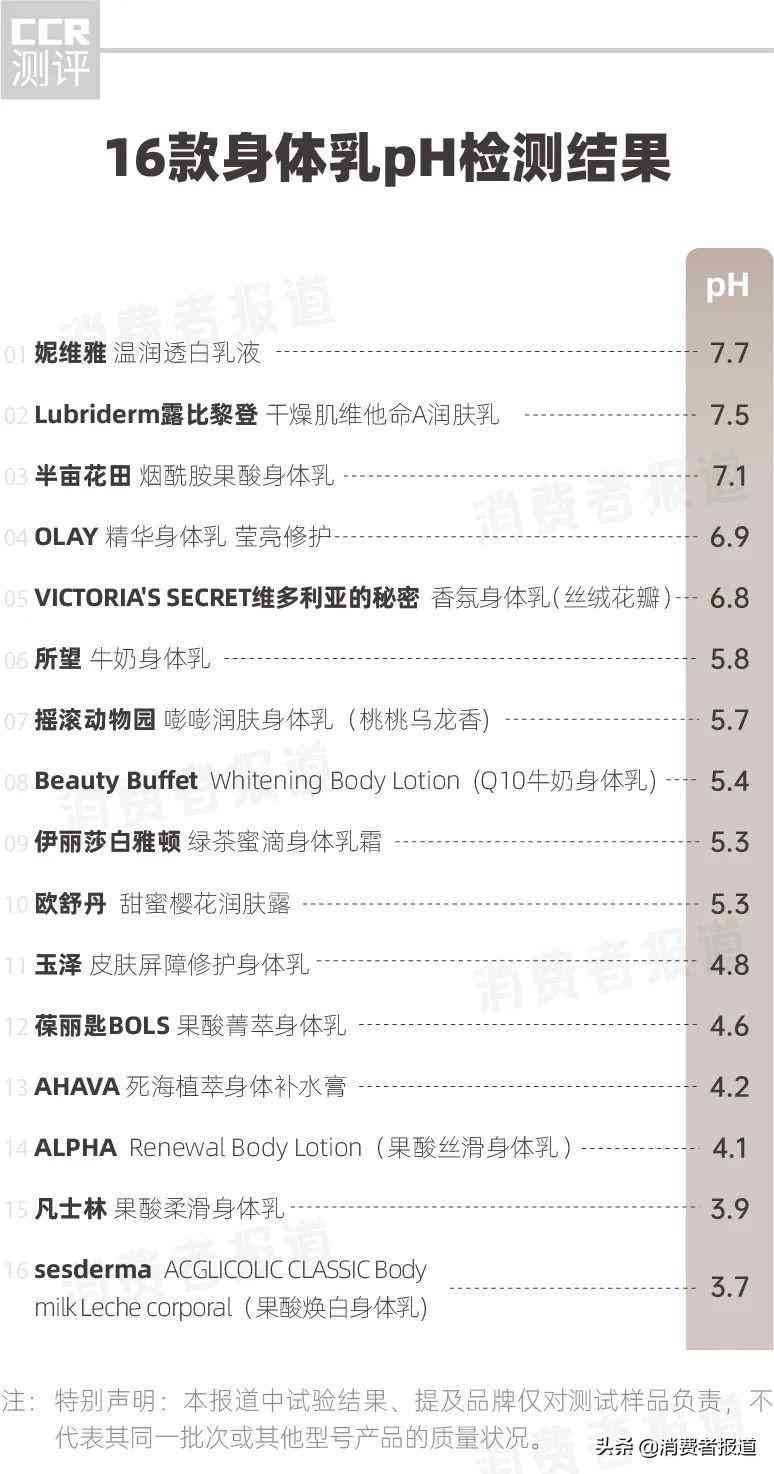 通过测试16款身体乳的pH,sesderma、凡士林、ALPHA、AHAVA、葆丽匙、玉泽等多款产品偏酸性,尤其是sesderma、凡士林两款,pH分别为3.7、3.9,果酸的加入使其pH相对偏低,温和性、肤感和气味也会大打折扣,这类产品不建议皮肤敏感的消费者使用。