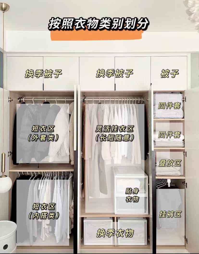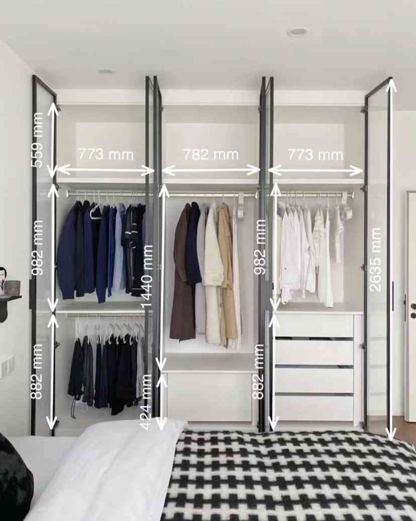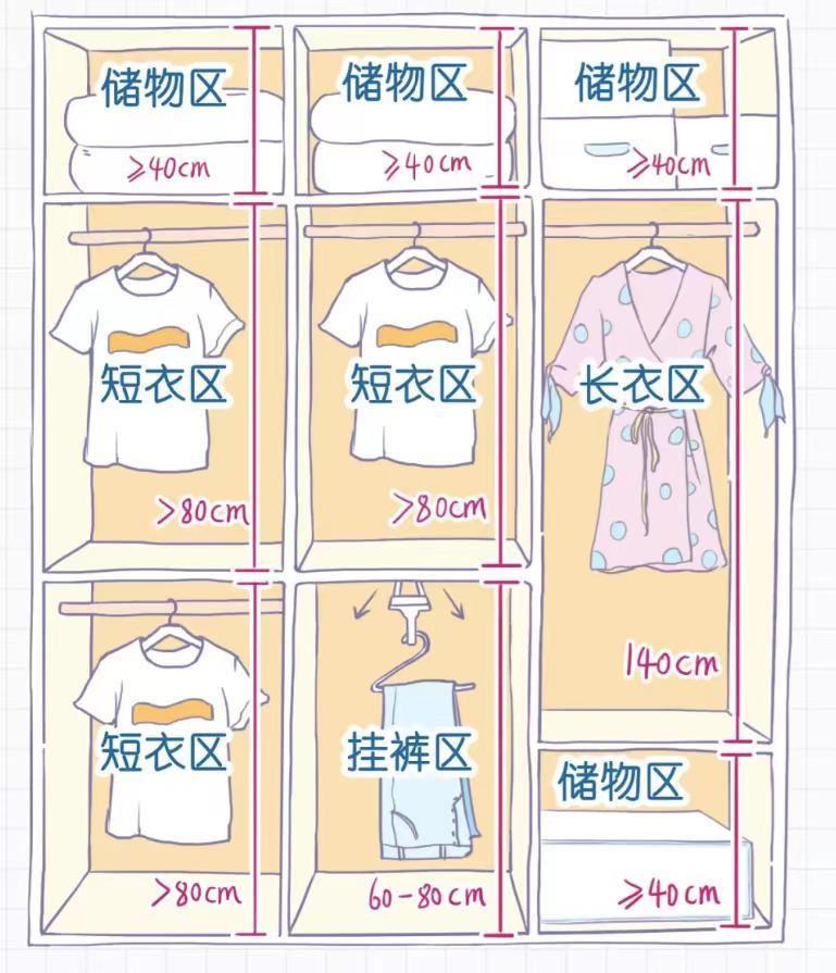 其次是根据家人穿衣习惯,将衣柜分为长衣区、短衣区、裤架区、储物区等。比如家里短衣较多,则衣柜在设计时,短衣区空间>长衣区空间。