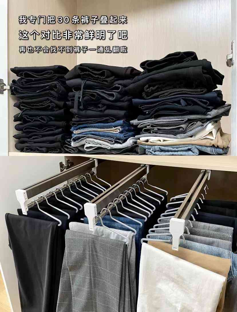 除上衣外,裤子的收纳还可以使用专门的抽拉裤架,安装在衣柜内,就能将家里全部的裤子有序“挂”出来,日常拿取也超级便捷。
