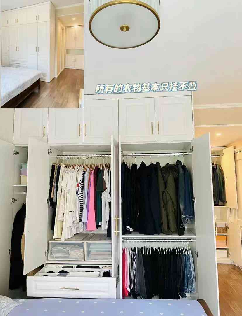 特别是现在定制衣柜都很高,隔板过高,叠放不方便,拿取上就更难,好好的空间白白浪费。而挂衣区却能一目了然,便捷拿取。
