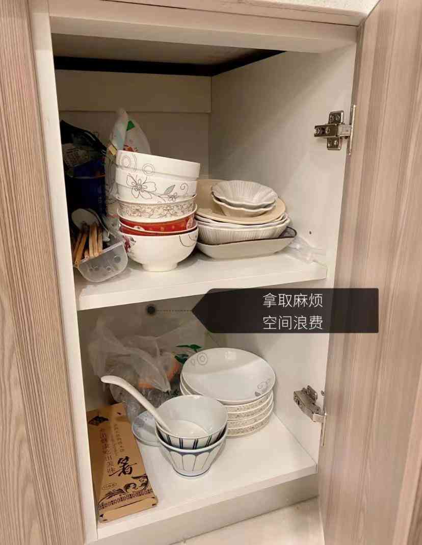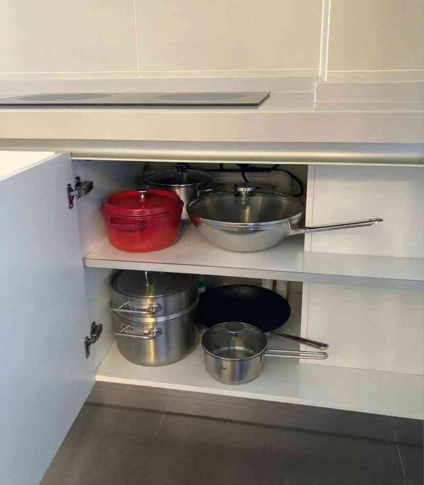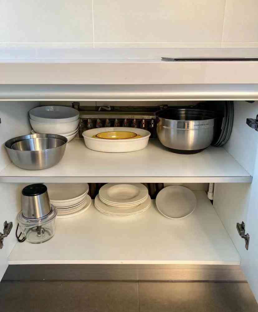 柜体隔板收纳,看起来空间大,实际使用起来非常没有头绪。普通的锅具随便往里一塞倒还好,但是碗盘收纳就显得很不方便。