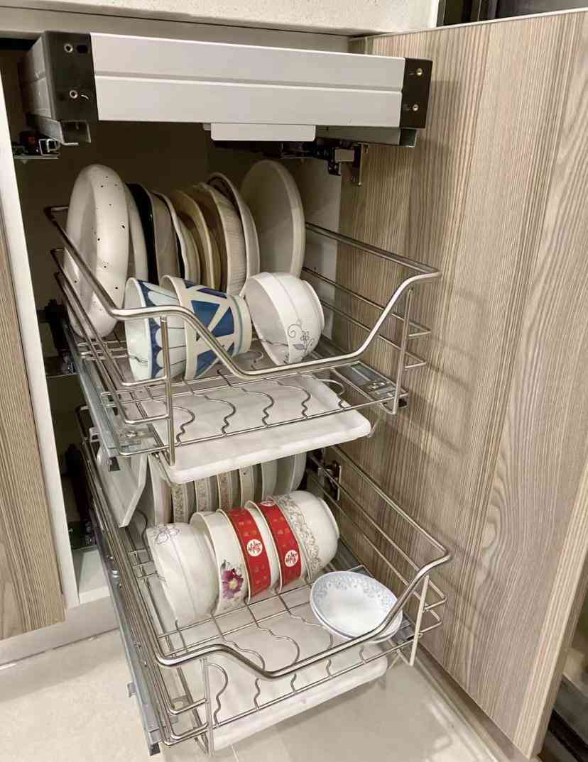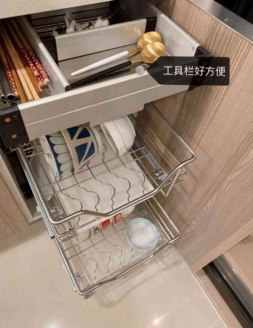 相比木质抽屉来说,这种小拉篮价格低安装方便,还有很多尺寸可以定制,很适合厨房抽屉少的情况。