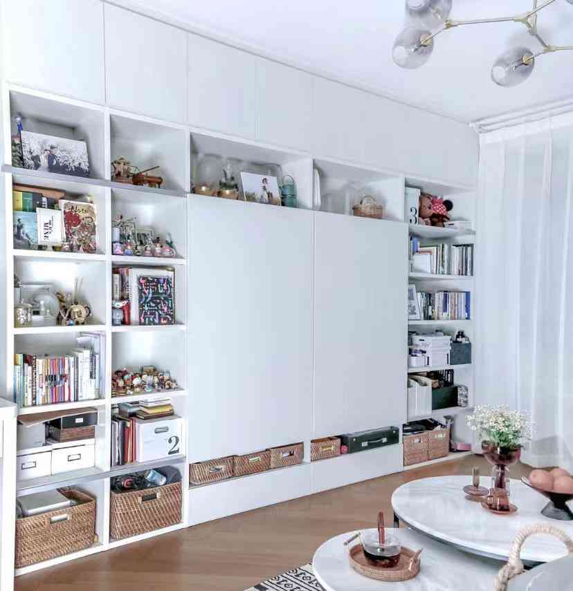 从收纳角度来说,如果并没有什么心爱的摆件,也并不爱买书看书,真的别赶潮流,安装柜门用起来更省心,也好打理。