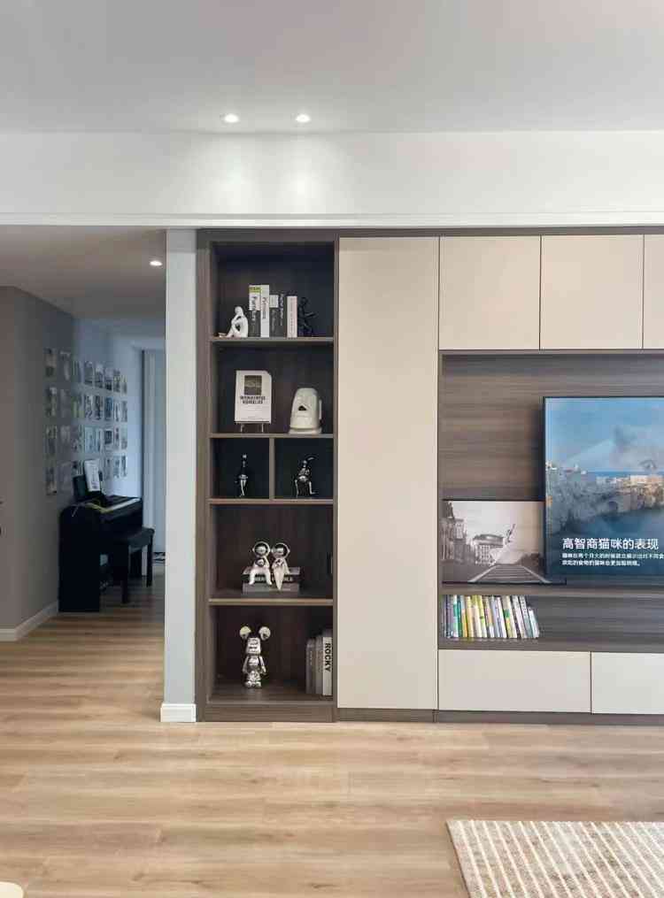 近两年更流行的是局部开放格的客厅储物柜设计,有些还会带灯带和玻璃柜门。相比大面积的开放格,稍微好一点。不过北方城市至少要一周清洁一次,要不然灰很厚,提醒一下,顶部格子要搬梯子才能够得着。