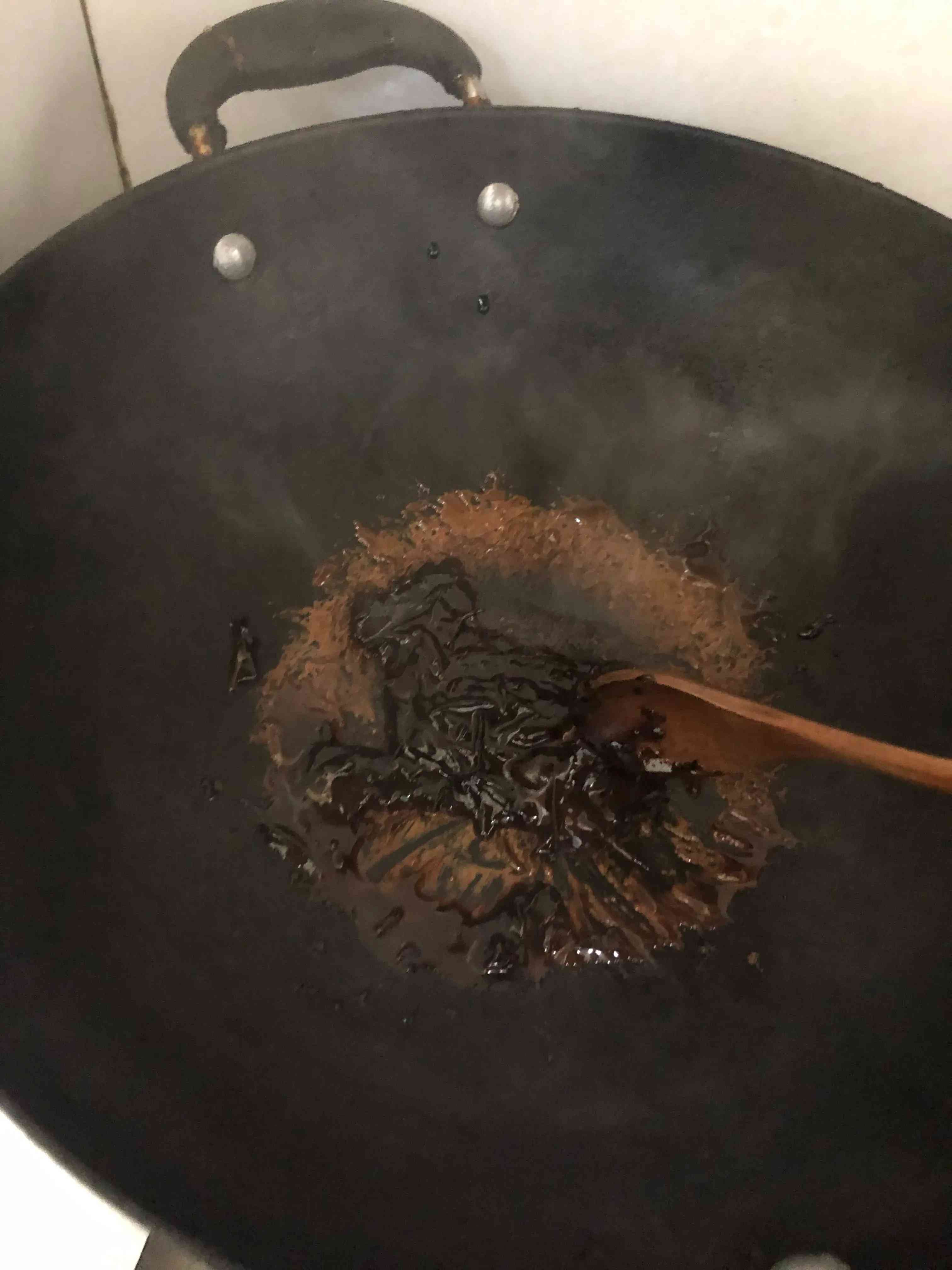 1、首先,锅刷干净不需要烧干,倒上些红糖,再加一撮今年的新茶,小火慢烧不断搅拌。