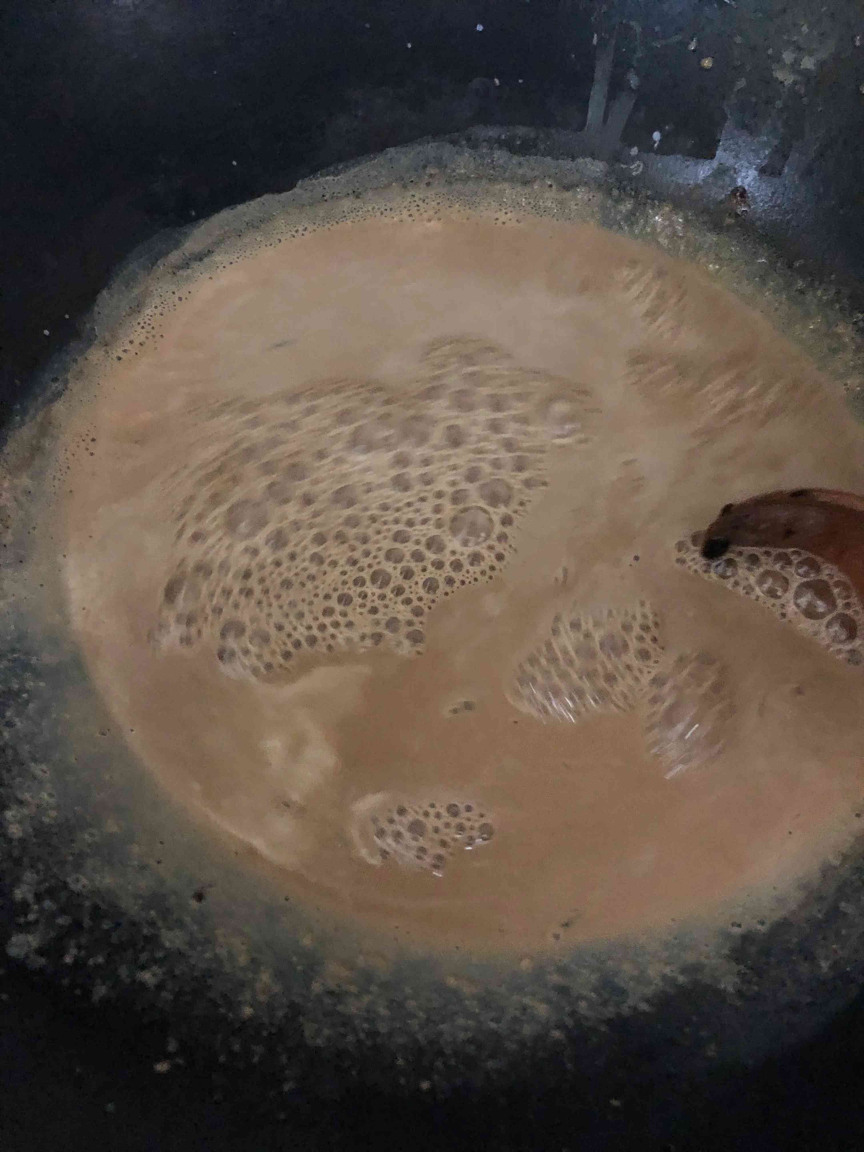 2、烧到红糖全部融化出现好多气泡倒入纯牛奶,此时融化的糖因牛奶倒入温度降低而变硬。不断搅拌,直至感觉无硬块即可关火。