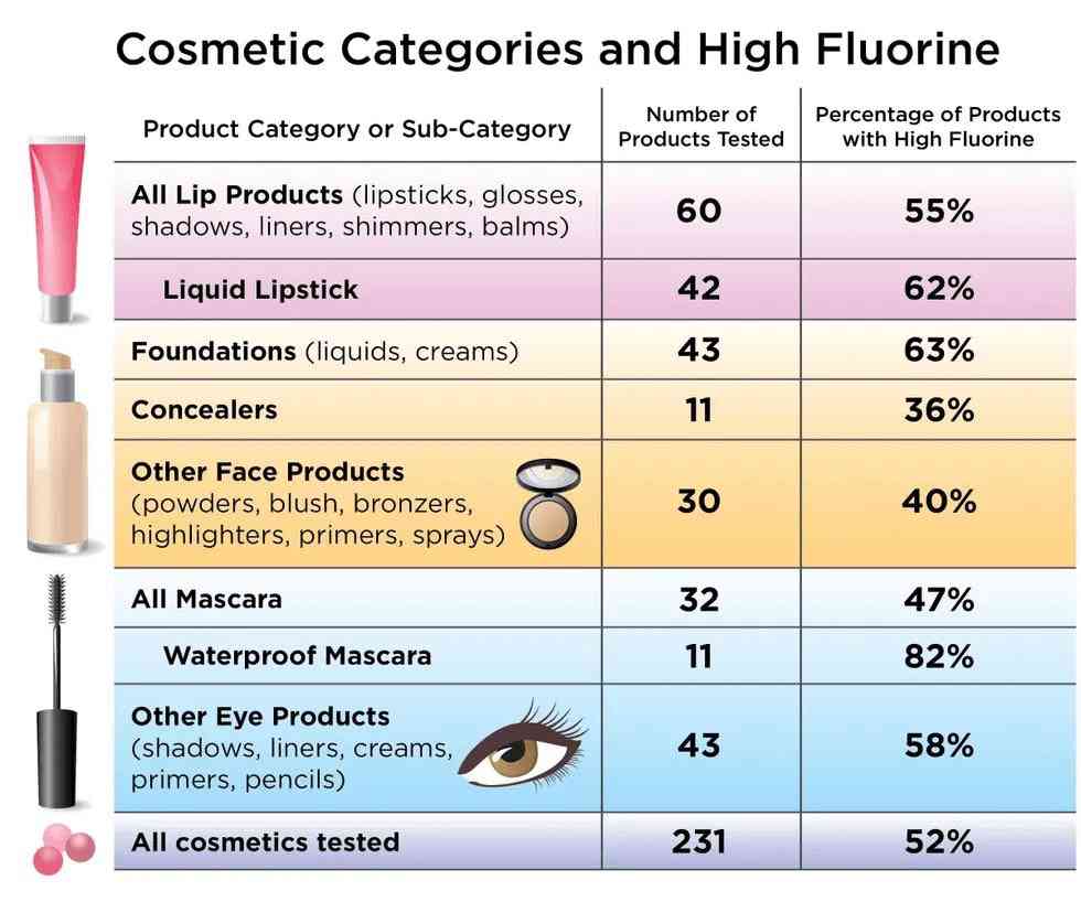 加州伯克利的绿色科学政策研究所的高级科学家、研究员Tom Bruton介绍道,研究人员在美国和加拿大购买了231种不同的化妆品,并对它们进行了氟检测,其中有一半以上的种类含氟量高。而在213种高氟产品中,化妆品类别所占比例最高的是粉底(63%)、眼部产品(58%)、睫毛膏(47%)和唇部产品(55%)。