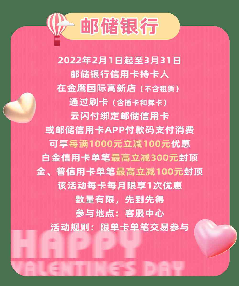 单笔交易满1000用100元,可与中心活动叠加使用,不与商场其他券同享。2月14日当天券升值50%使用,使用规则不变(满1000减100);