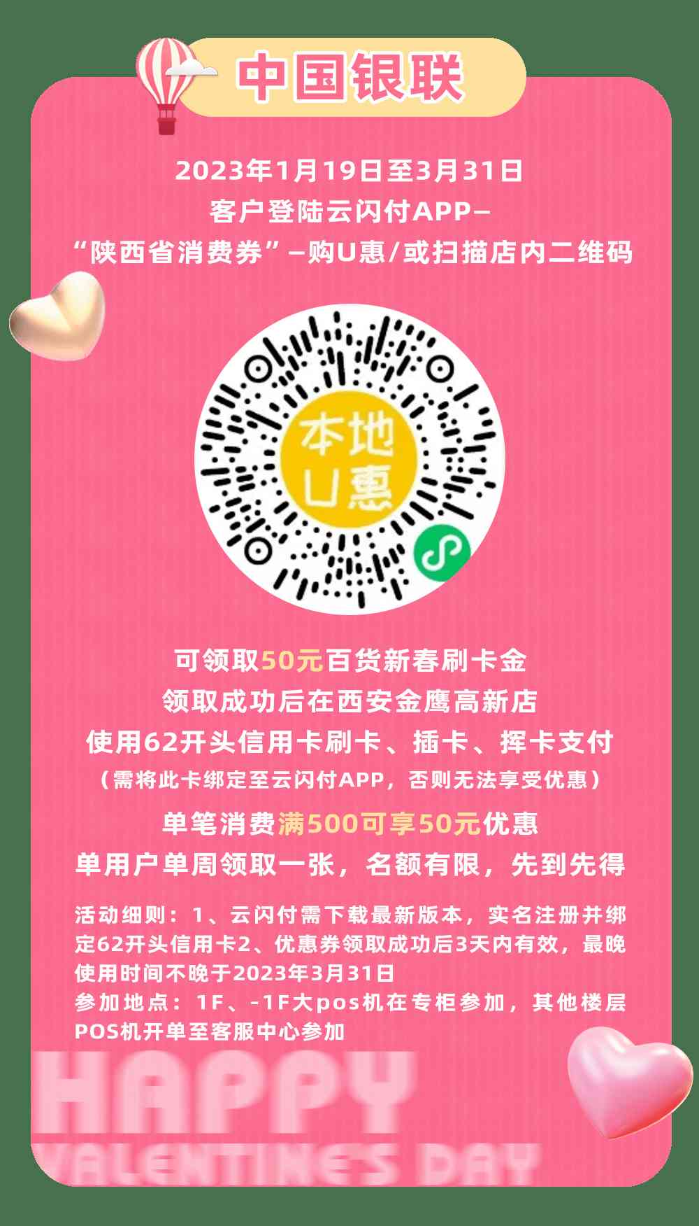 单笔交易满500用100元,不与商场其他活动同享。2月14日当天券升值50%使用,使用规则不变(满500减100)。