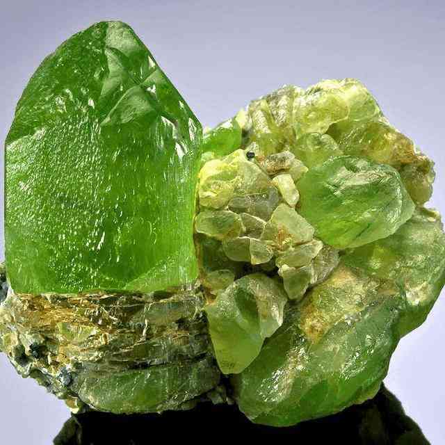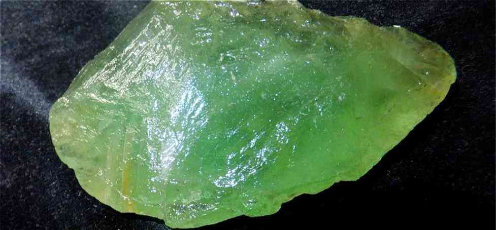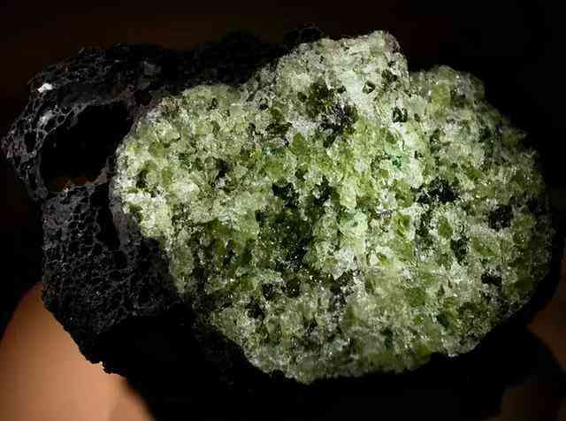 2、蛟河橄榄石。产于吉林东部,是中国两个橄榄石矿之一。橄榄绿色、黄绿色、翠绿色。