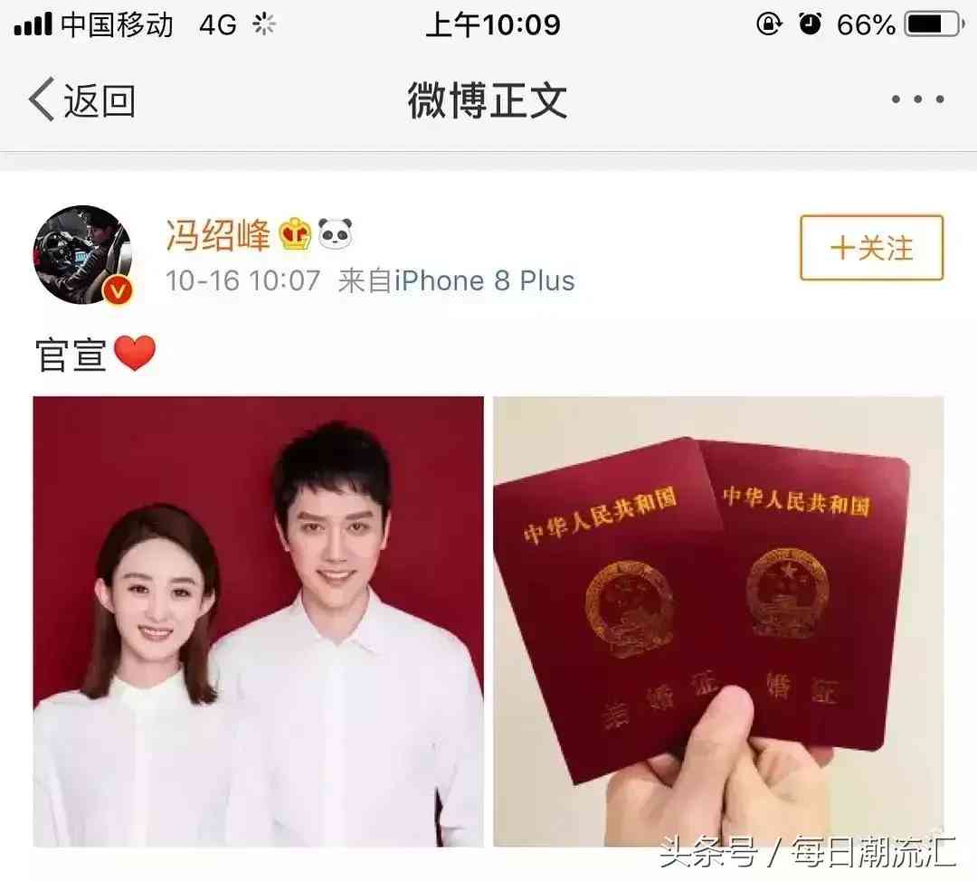 昨天早上,赵丽颖冯绍峰在微博公布恋情,并晒出了结婚证。