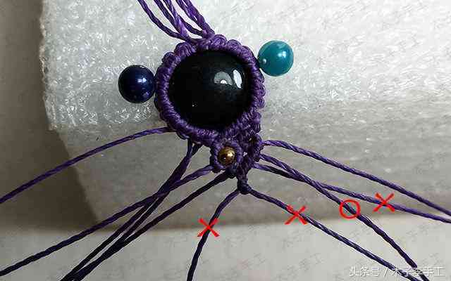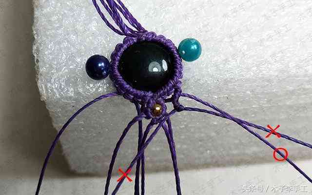 10、包进一颗10mm的圆形练手石,最后的两根轴线也做一个斜卷结,这4个斜卷结的方向要一致,把这4个斜卷结都拉紧一点,石头就不会掉出来