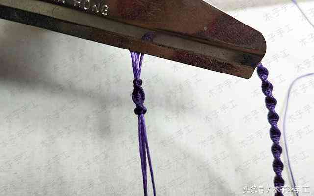 11、把它固定好,以做斜卷结的两根线为轴,做雀头结网的两根线为绕线分别在轴线上做一个斜卷结,左边的线做右斜卷结,右边的线做左斜卷结